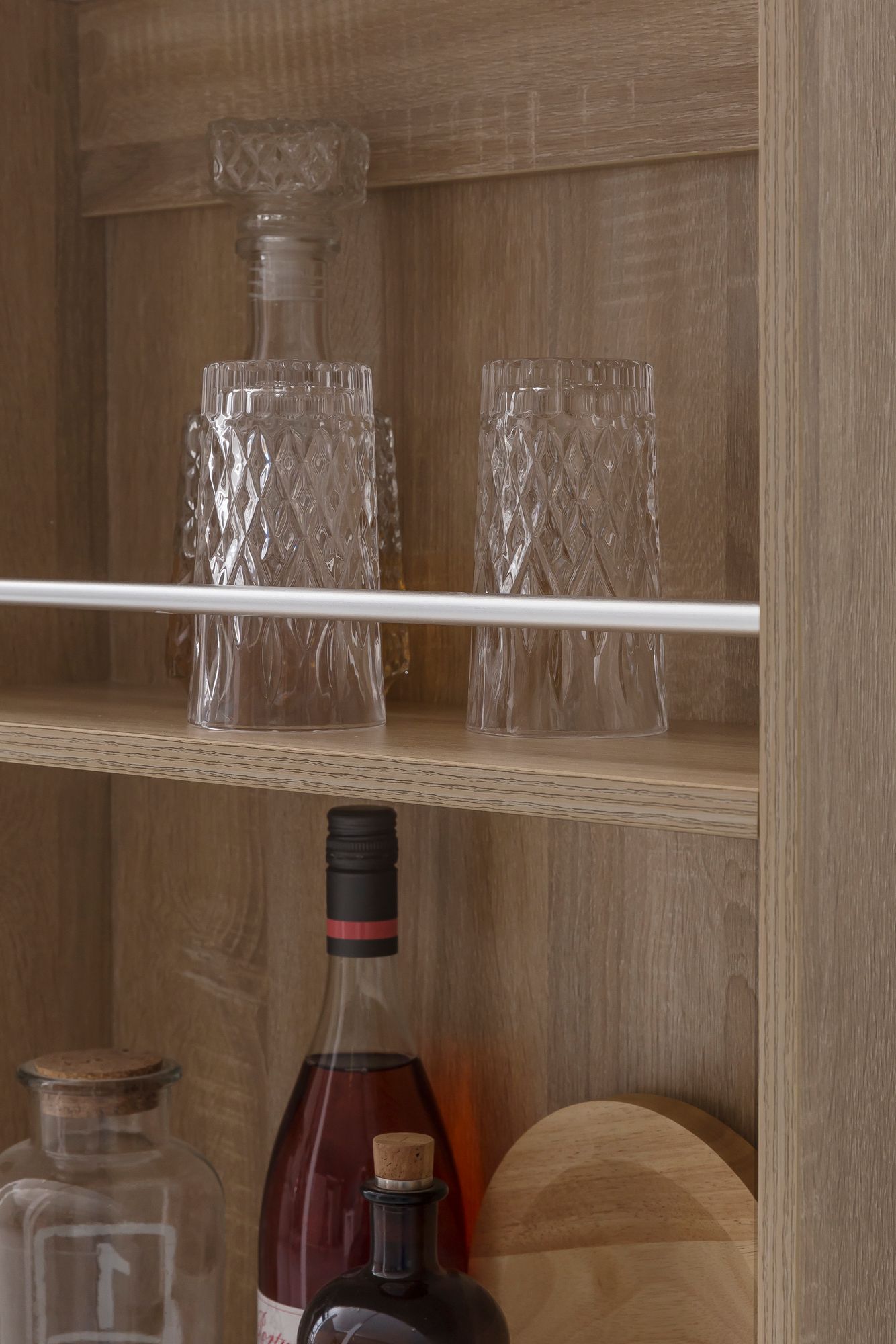 - Drei Fächer zur Unterbringung von Weinflaschen, Gläser und Küchenutensilien