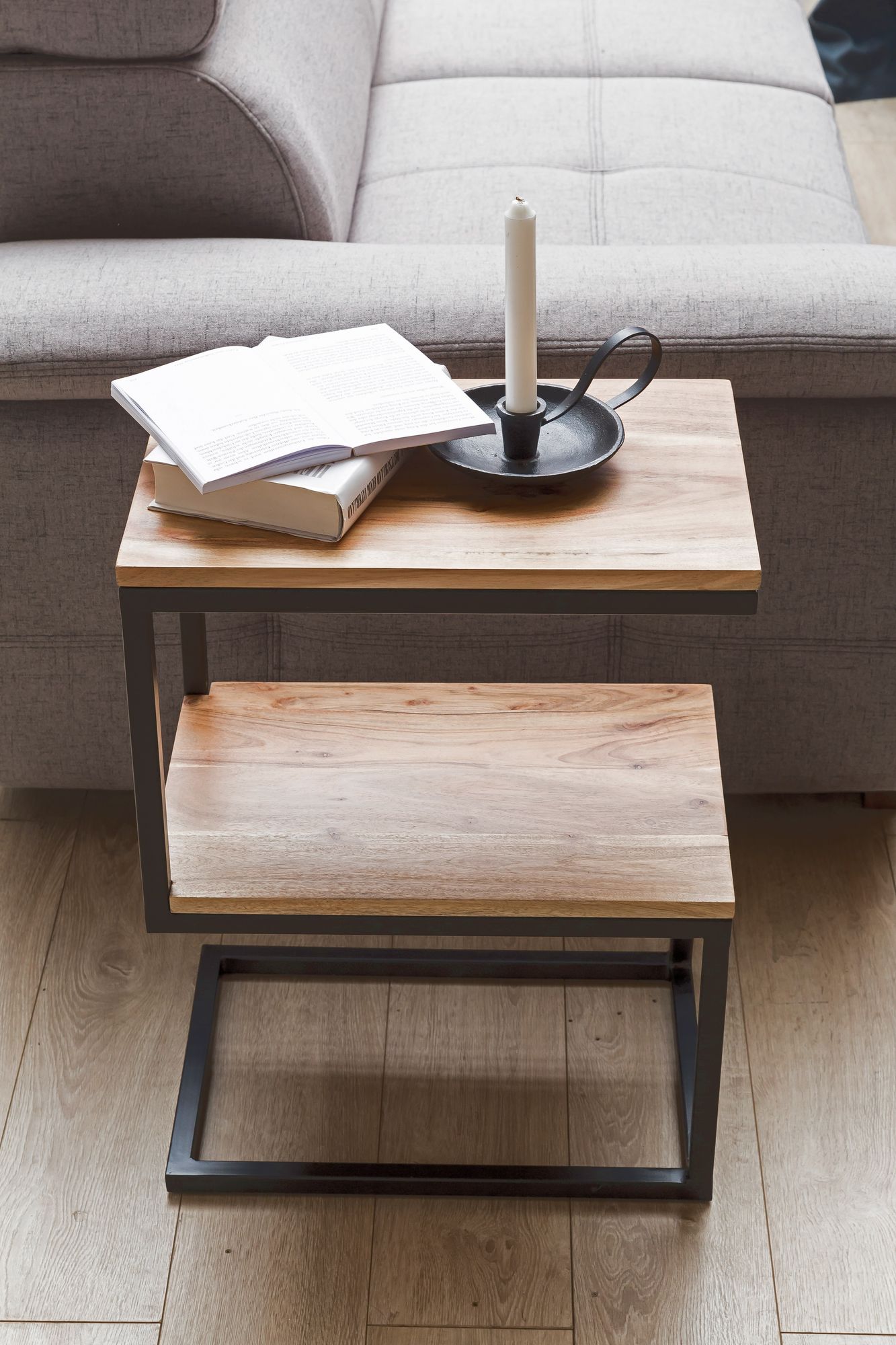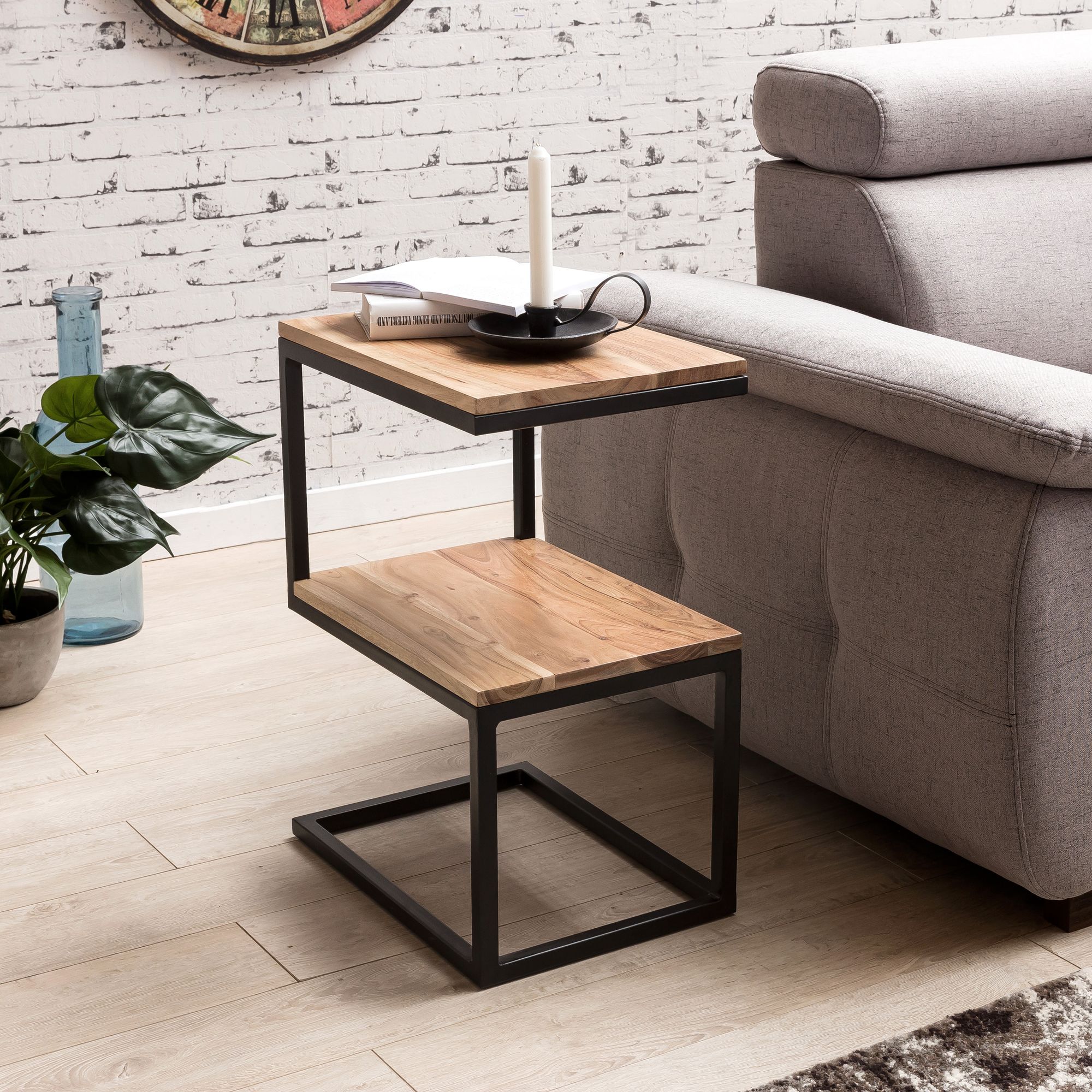 WOHNLING Beistelltisch AKOLA WL5.208 S-Form Massiv-Holz Akazie / Metall 45 x 60 x 30 cm | Design Wohnzimmertisch Landhaus-Stil | Anstelltisch Ablagetisch eckig