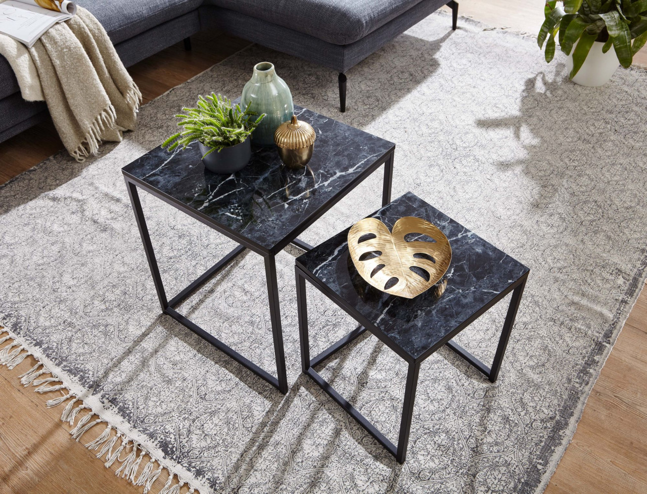 WOHNLING Design Beistelltisch 2er Set Schwarz Marmor Optik Eckig