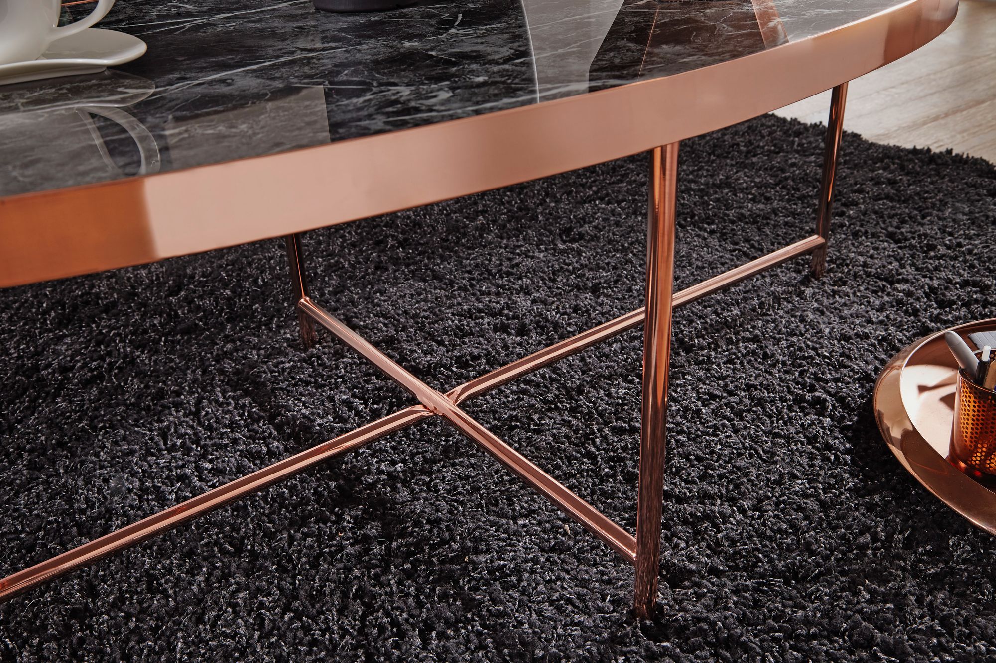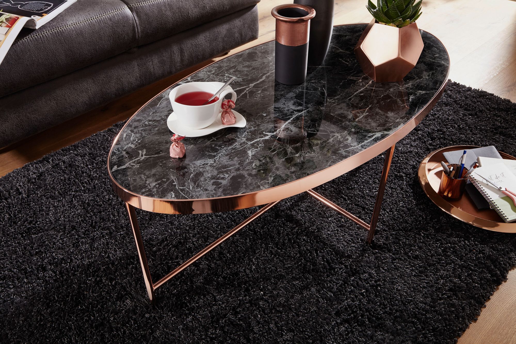 WOHNLING Design Couchtisch WL5.990 Marmor Optik Schwarz - Oval 110 x 56 cm mit Kupfer Metallgestell | Großer Wohnzimmertisch | Lounge Tisch