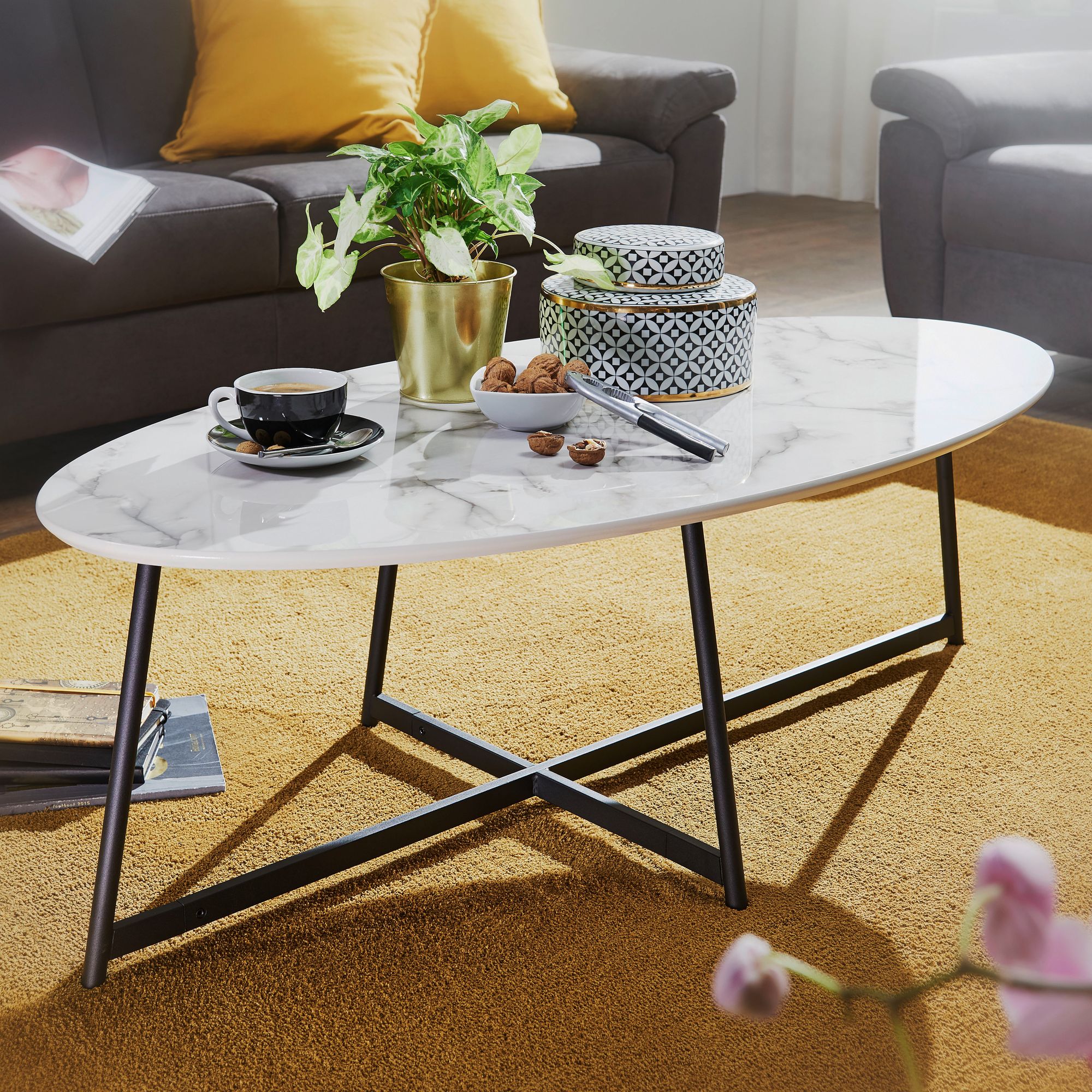 WOHNLING Design Couchtisch WL6.004 Oval 120x60 cm mit Marmor Optik Weiß | Wohnzimmertisch mit Metall-Beine Schwarz | Großer Beistelltisch