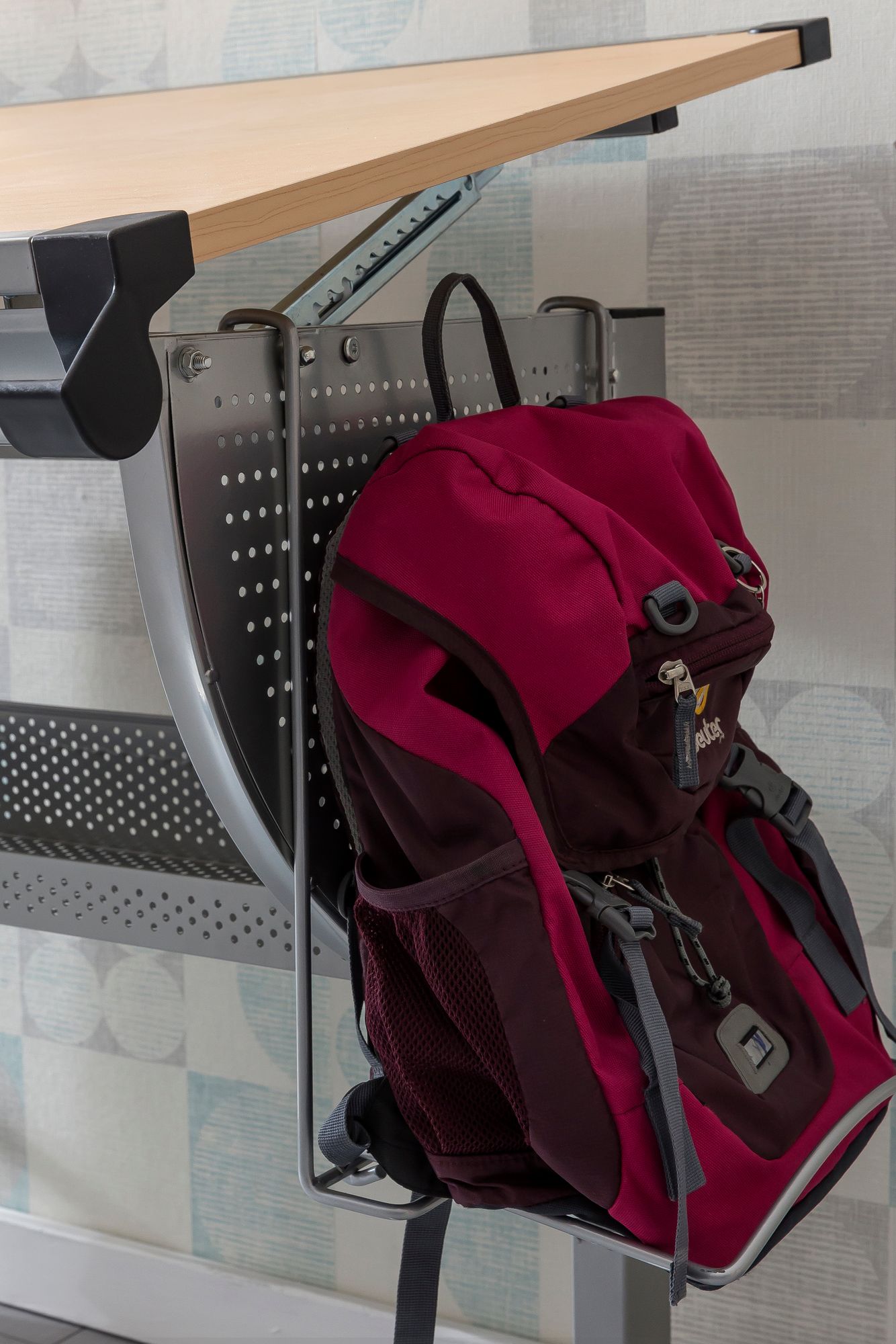 - Unter der Tischplatte befindet sich ein Ablagekorb