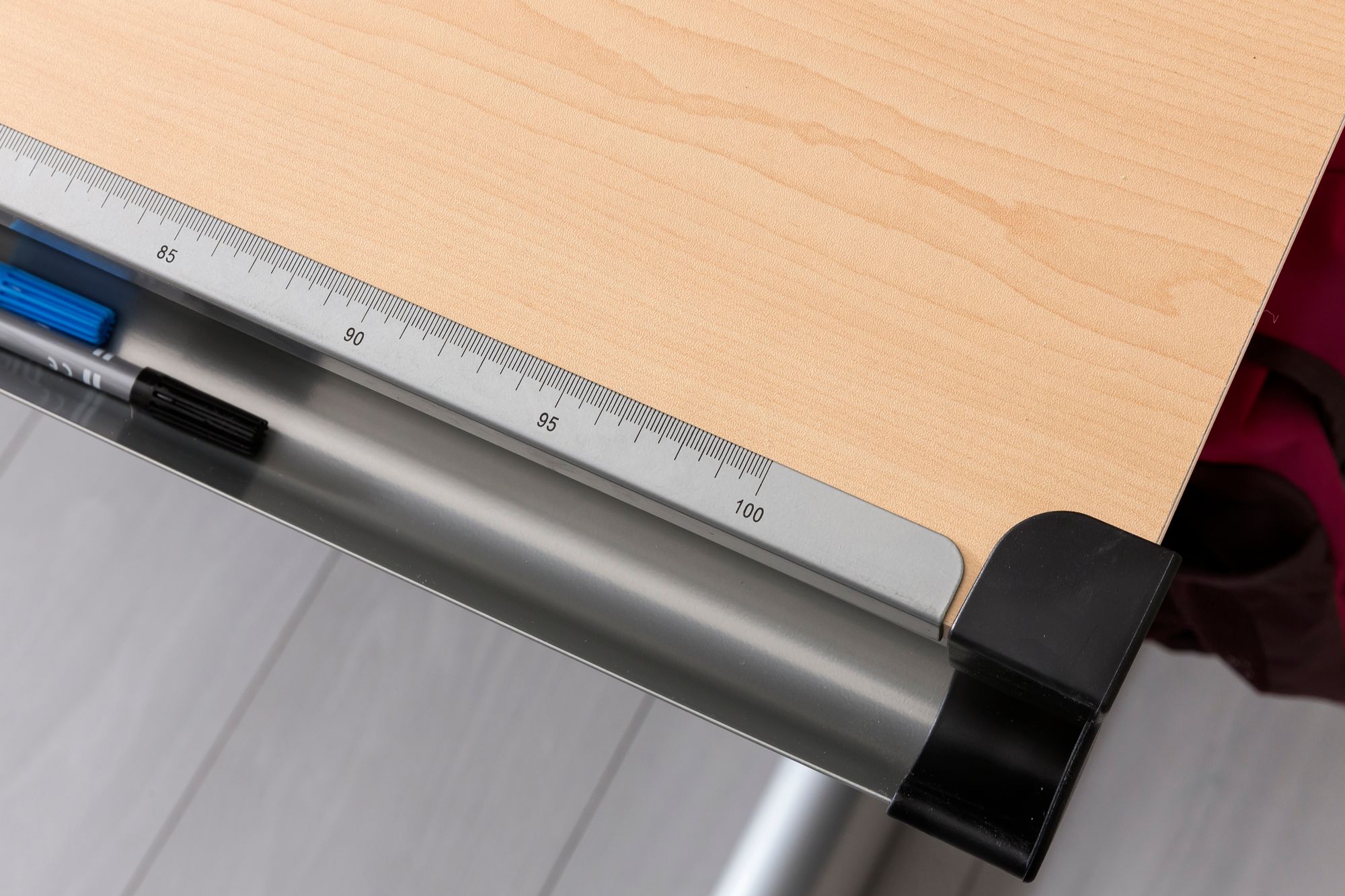 - Der Tisch hat zwei integrierte Lineale die oben und unten an der Tischplatte angebracht sind