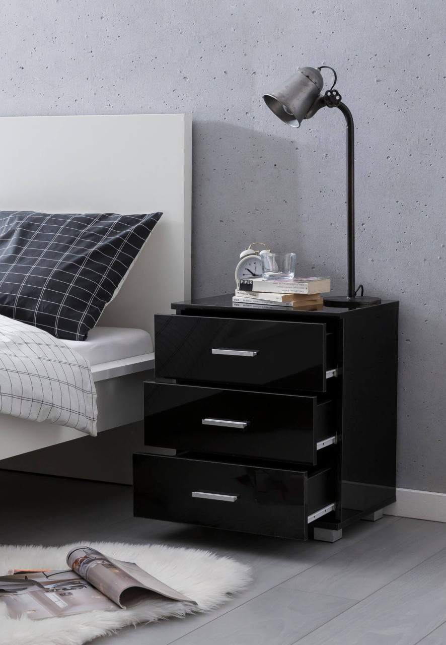 WOHNLING Design Nachtkonsole Raya Schwarz 45x54x34cm Holz Nachttisch Hochglanz
