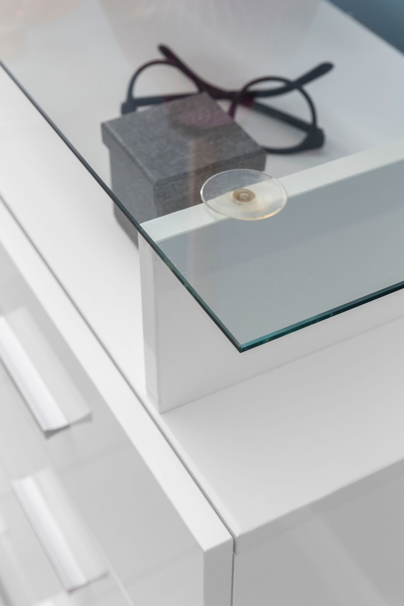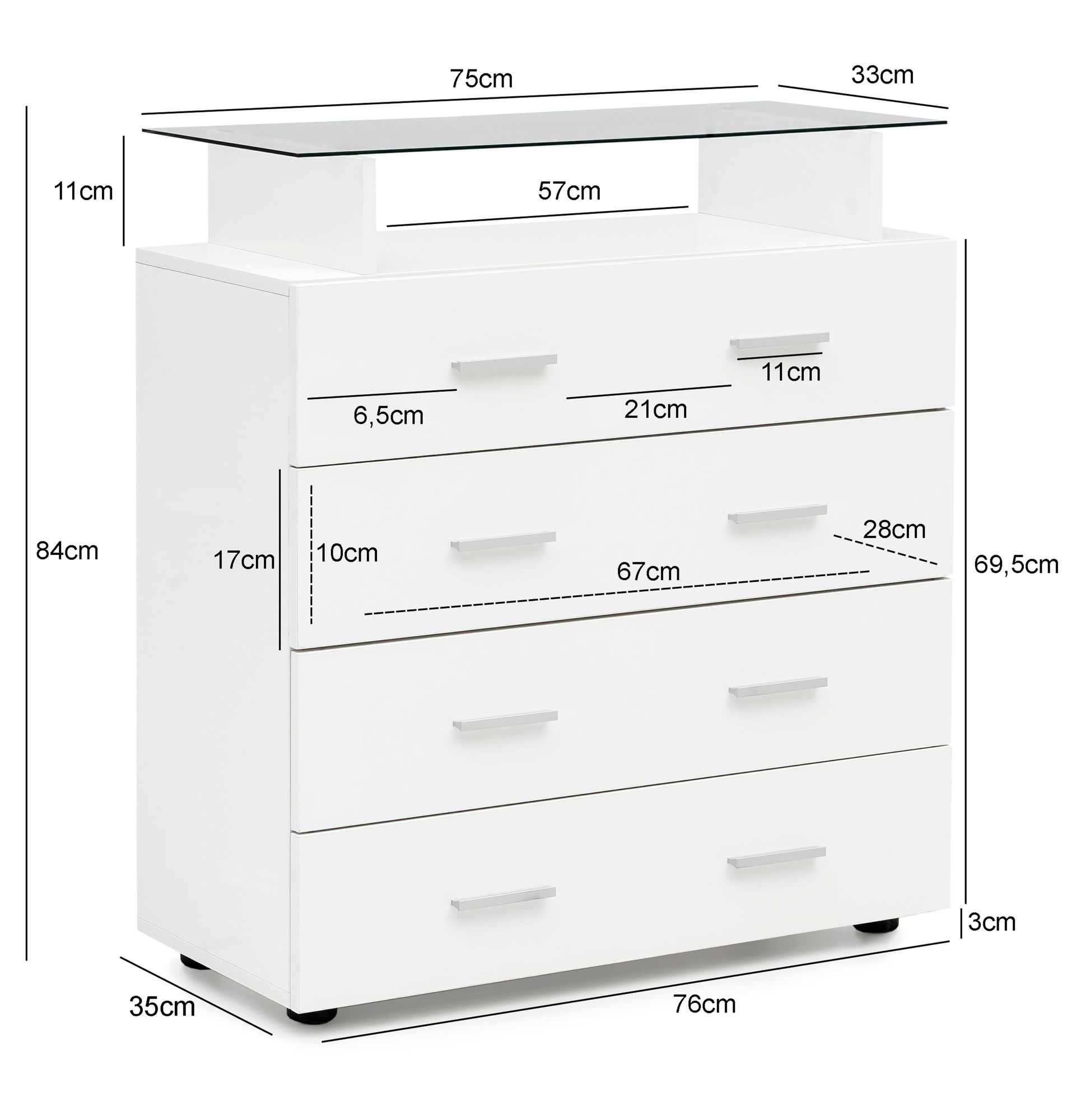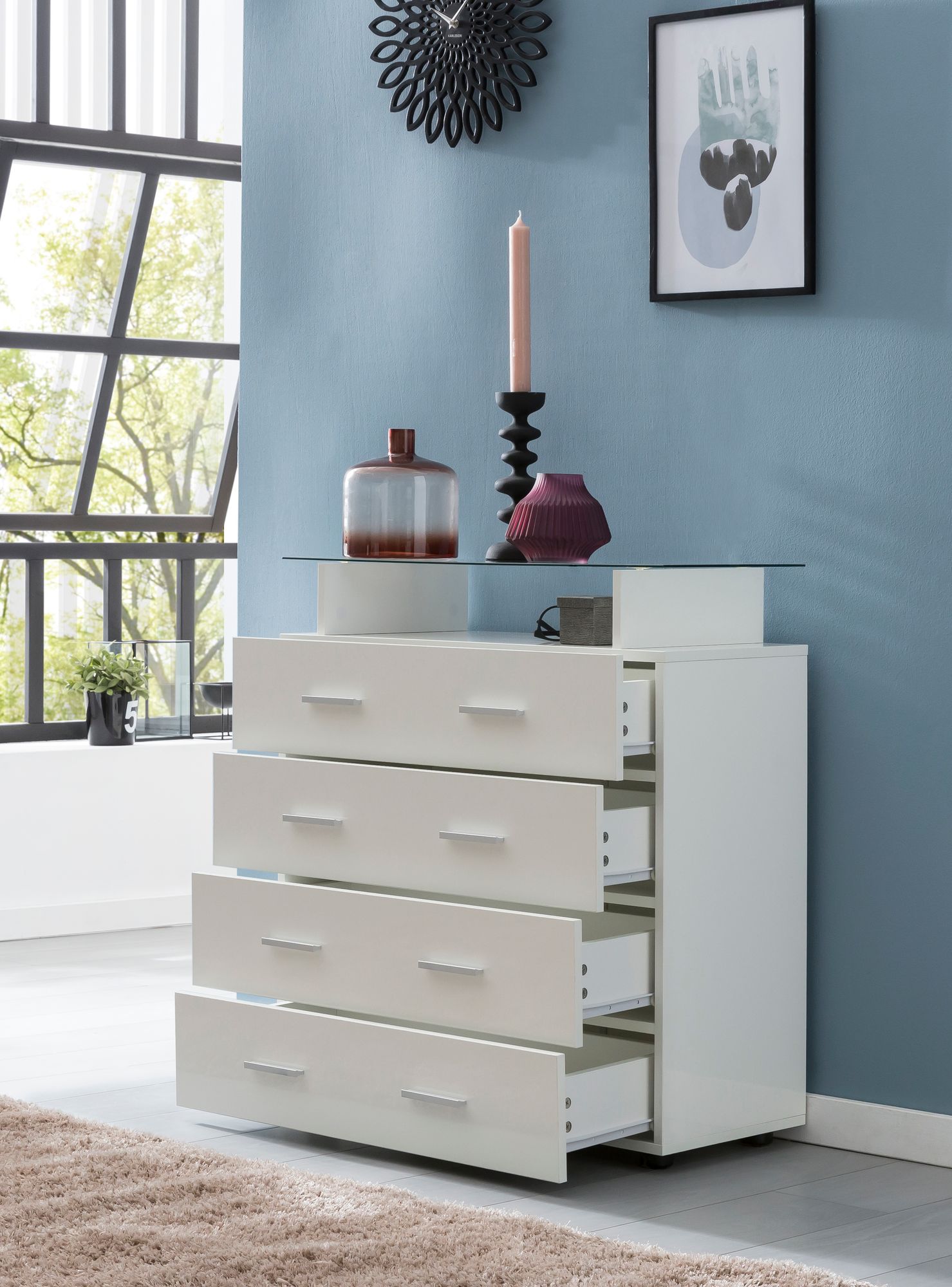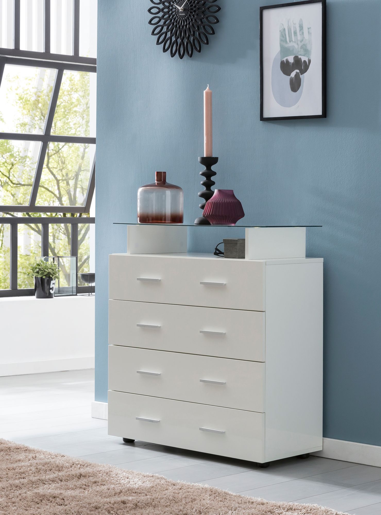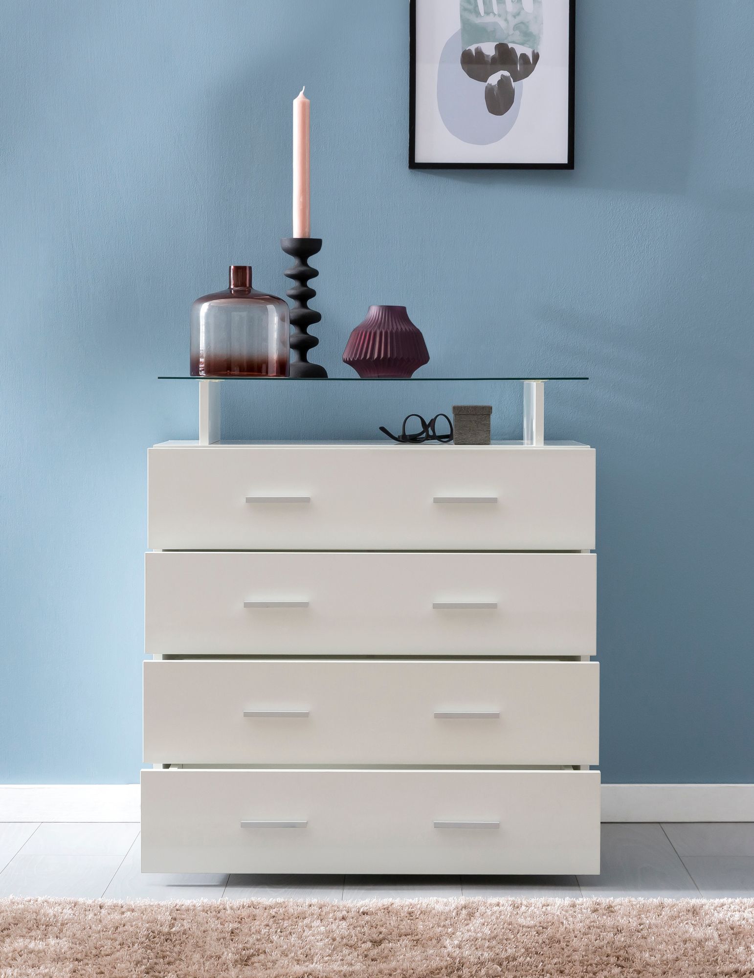 - Kommode mit vier Schubladen und einer Glasplatte