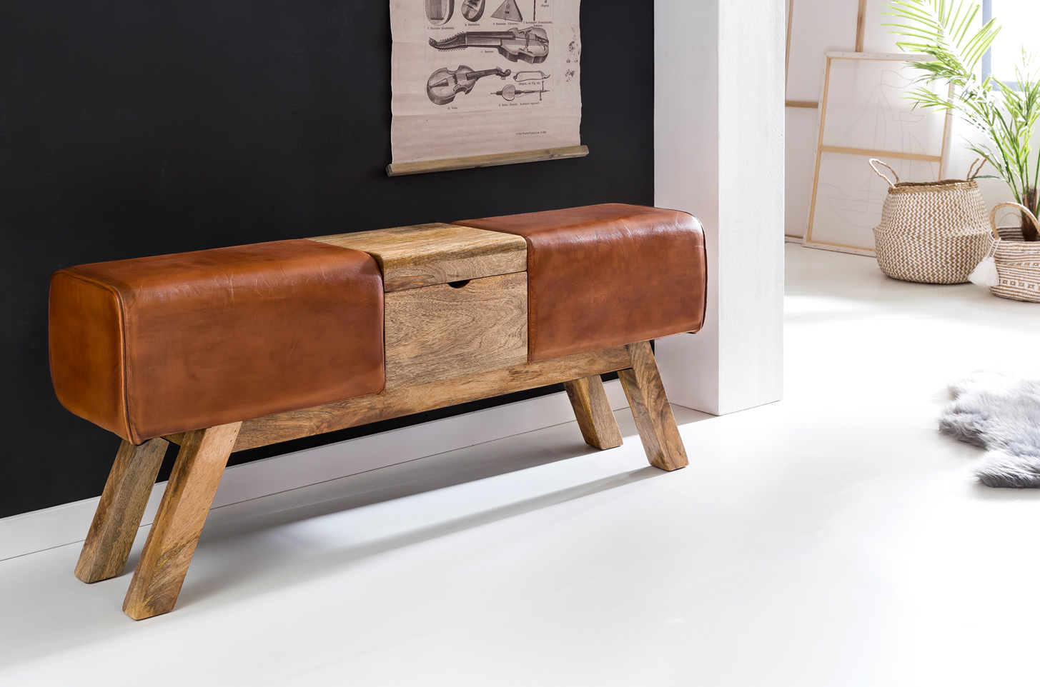 WOHNLING Design Turnbock Sitzbank WL5.098 Braun Aufbewahrungsfach 120 x 29 x 53 cm | Turnhocker Bank aus Echtleder Klappfach | Hocker Garderobenbank Sitzhocker Springbock Turnbank