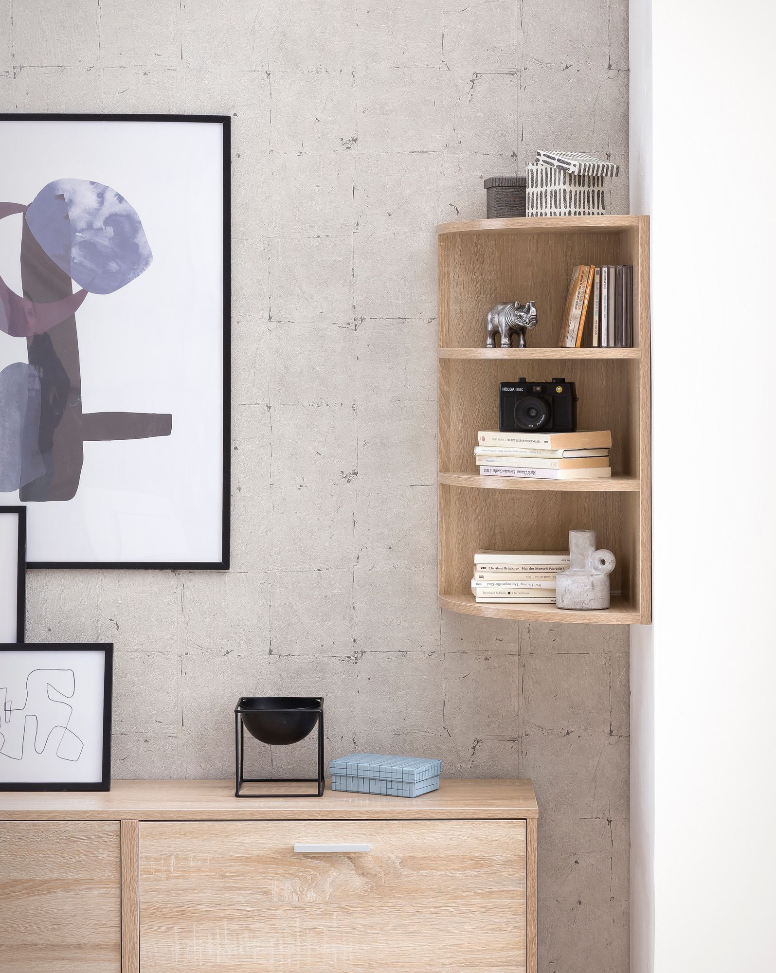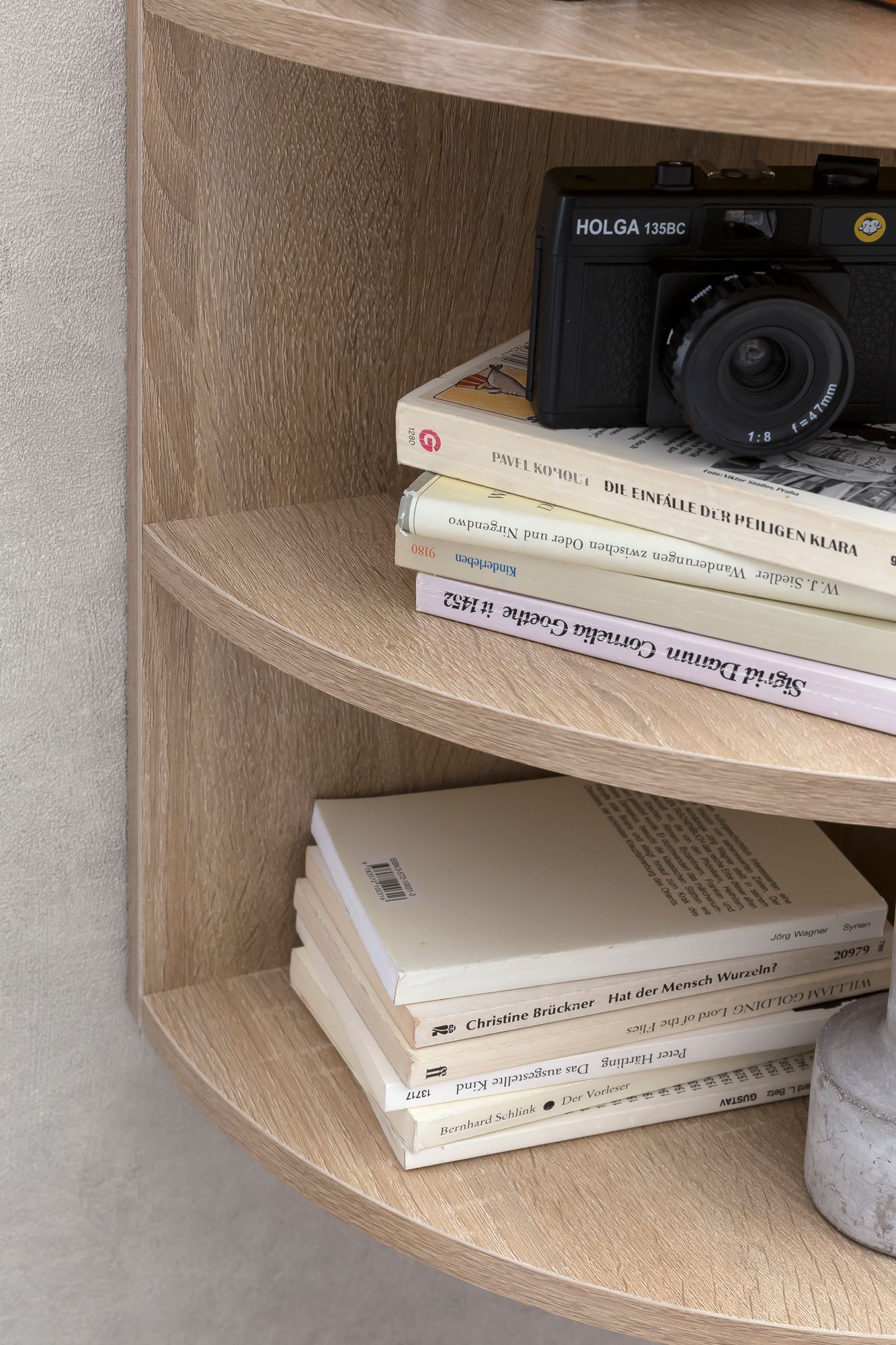 - Leichtigkeit strahlt das Hängeregal durch die runde Front aus