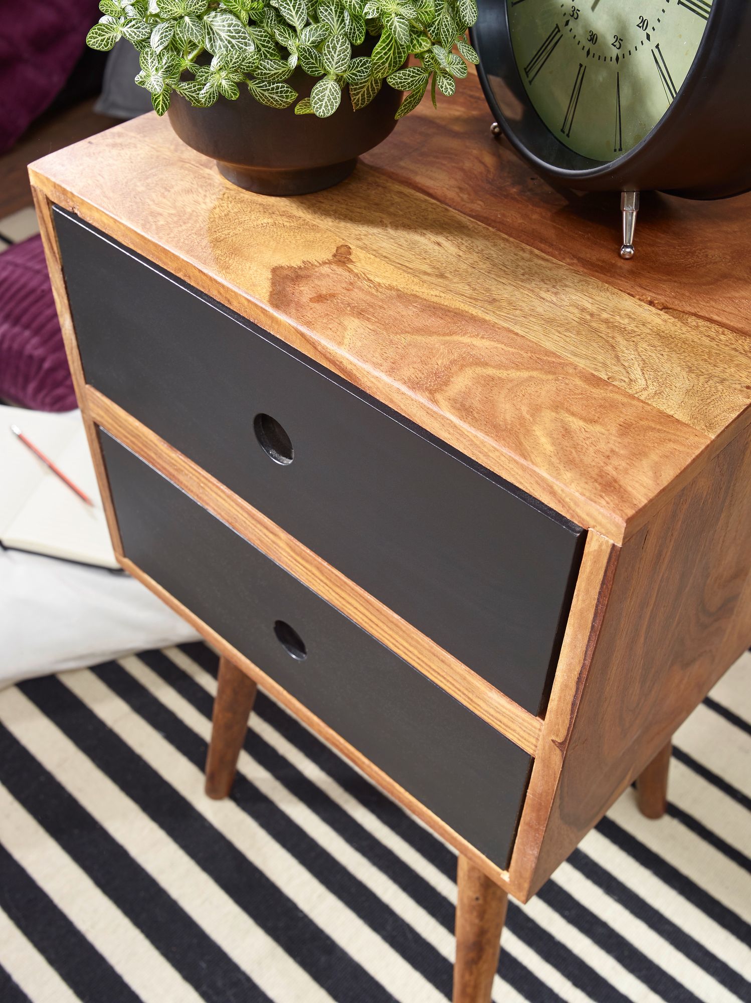 WOHNLING Retro Nachtkonsole REPA WL1.968 / Sheesham-Holz Nachttisch mit 2 Schubladen dunkelbraun / schwarz