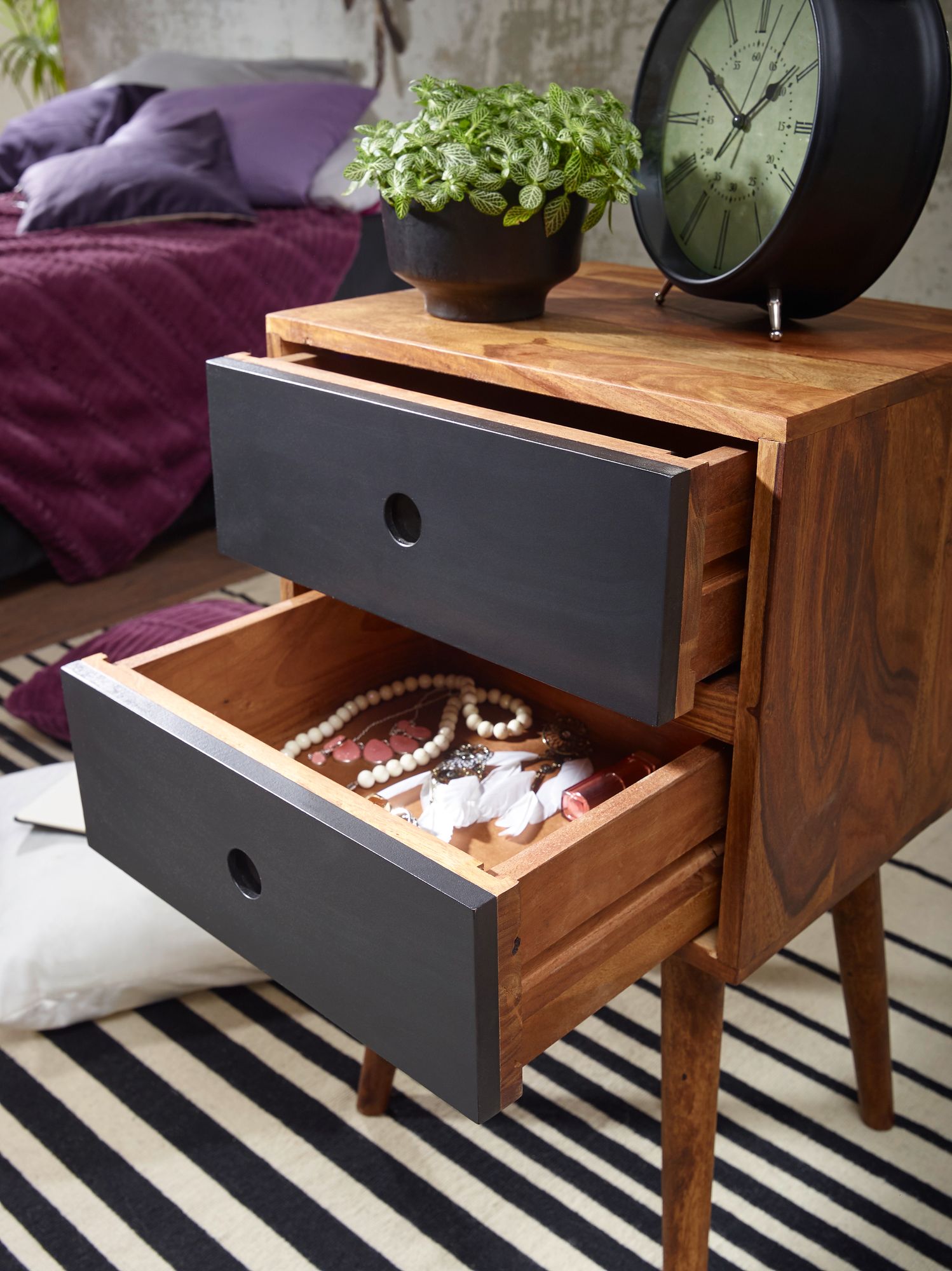 Produktinformationen "WOHNLING Retro Nachtkonsole REPA / Sheesham-Holz Nachttisch mit 2 Schubladen dunkelbraun / schwarz"