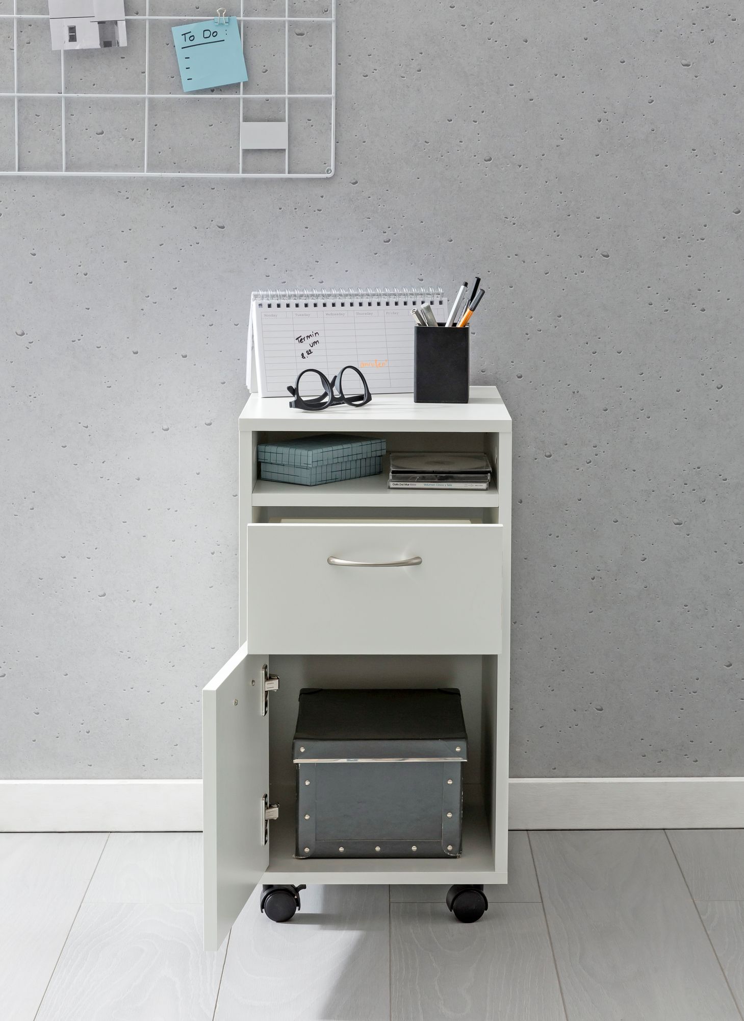 WOHNLING Rollcontainer WL5.901 Weiß 33x63x38 cm Schreibtisch-Unterschrank Holz | Roll-Kommode Modern | Bürocontainer Schubladenschrank mit Tür | Kleiner Schreibtischschrank mit Rollen
