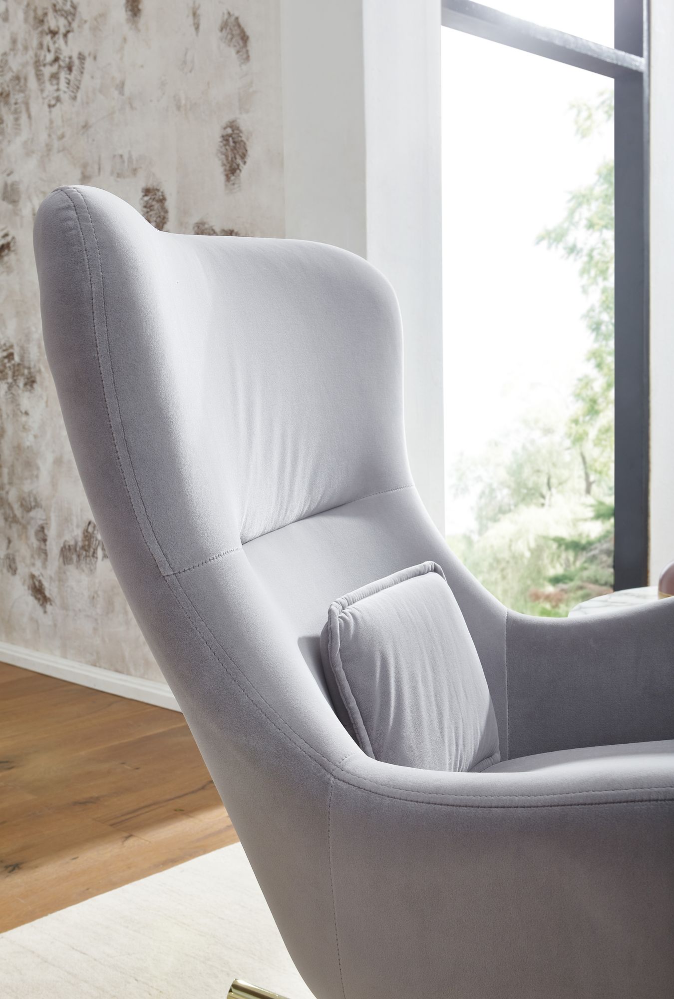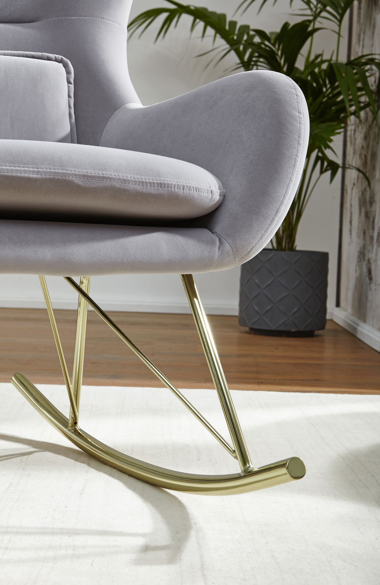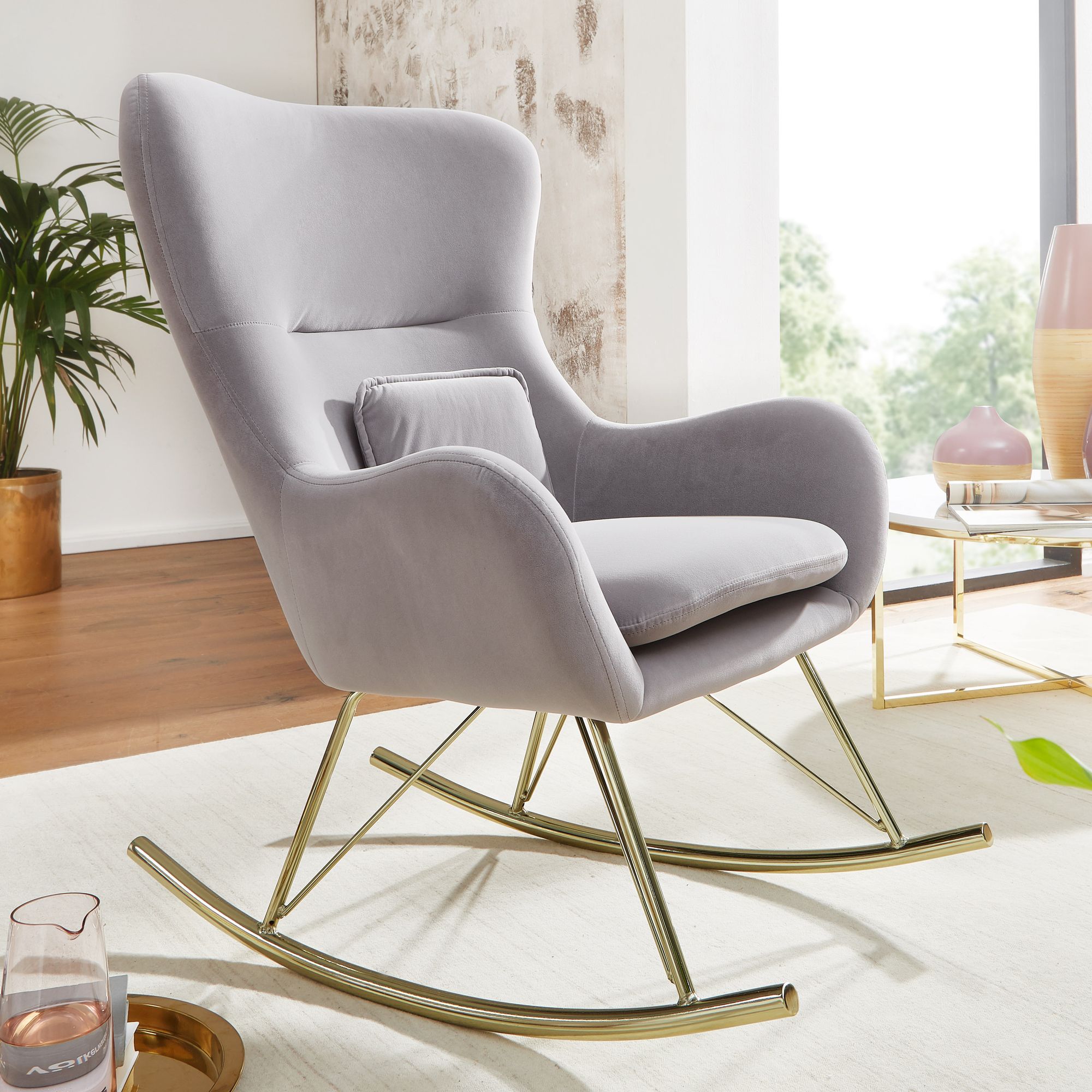 Produktinformationen "WOHNLING Schaukelstuhl Samt / Metall Hellgrau mit goldenen Beinen"