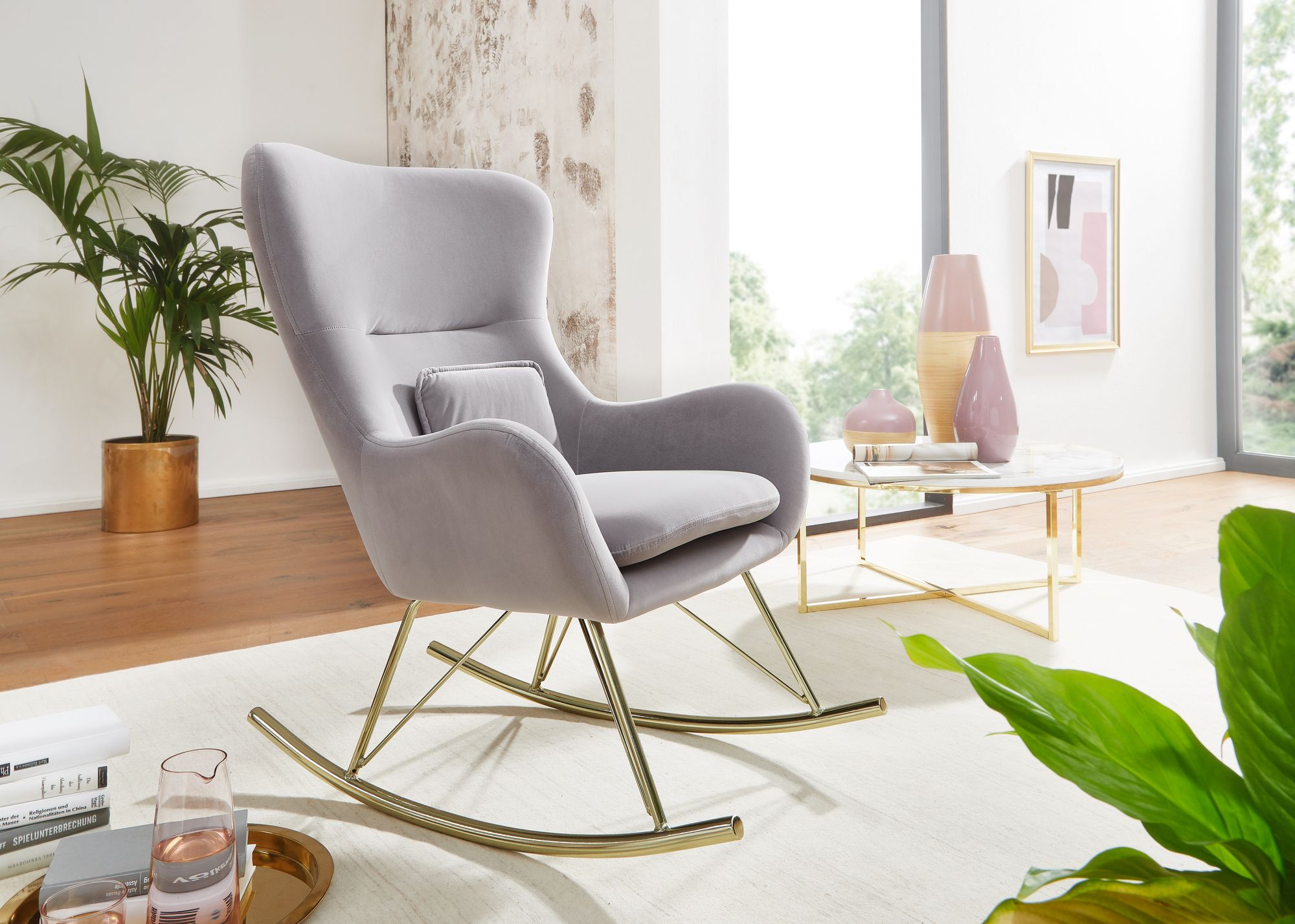 WOHNLING Schaukelstuhl WL6.201 Samt / Metall Hellgrau mit goldenen Beinen
