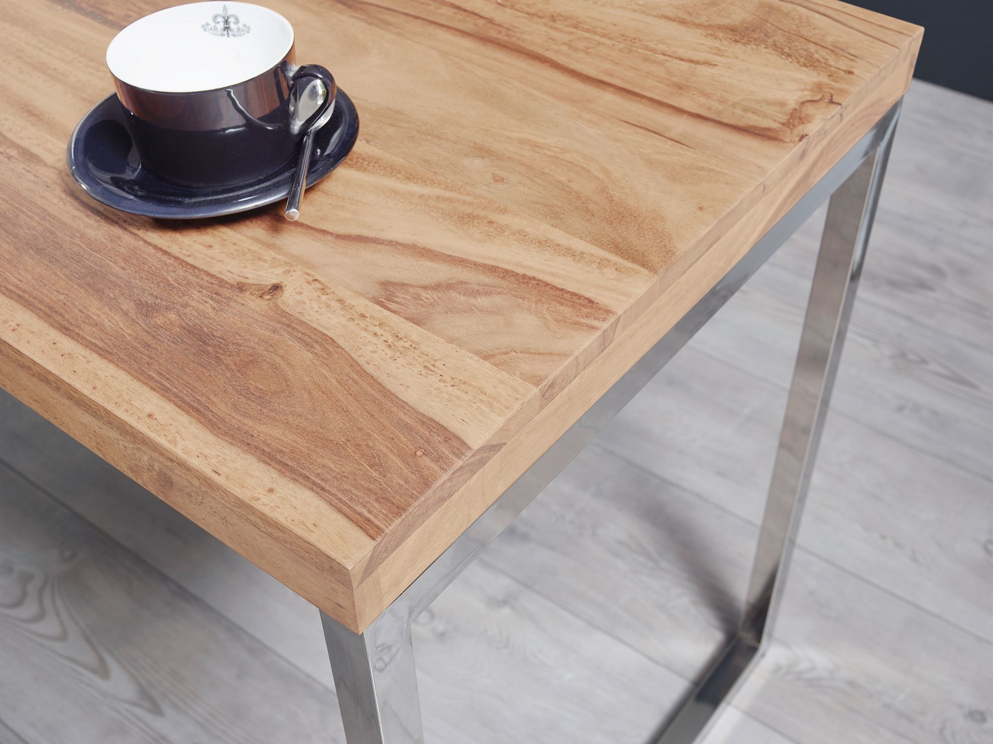 - Verchromtes Metallgestell an beiden Seiten - Kontrast zum warmen Holzton