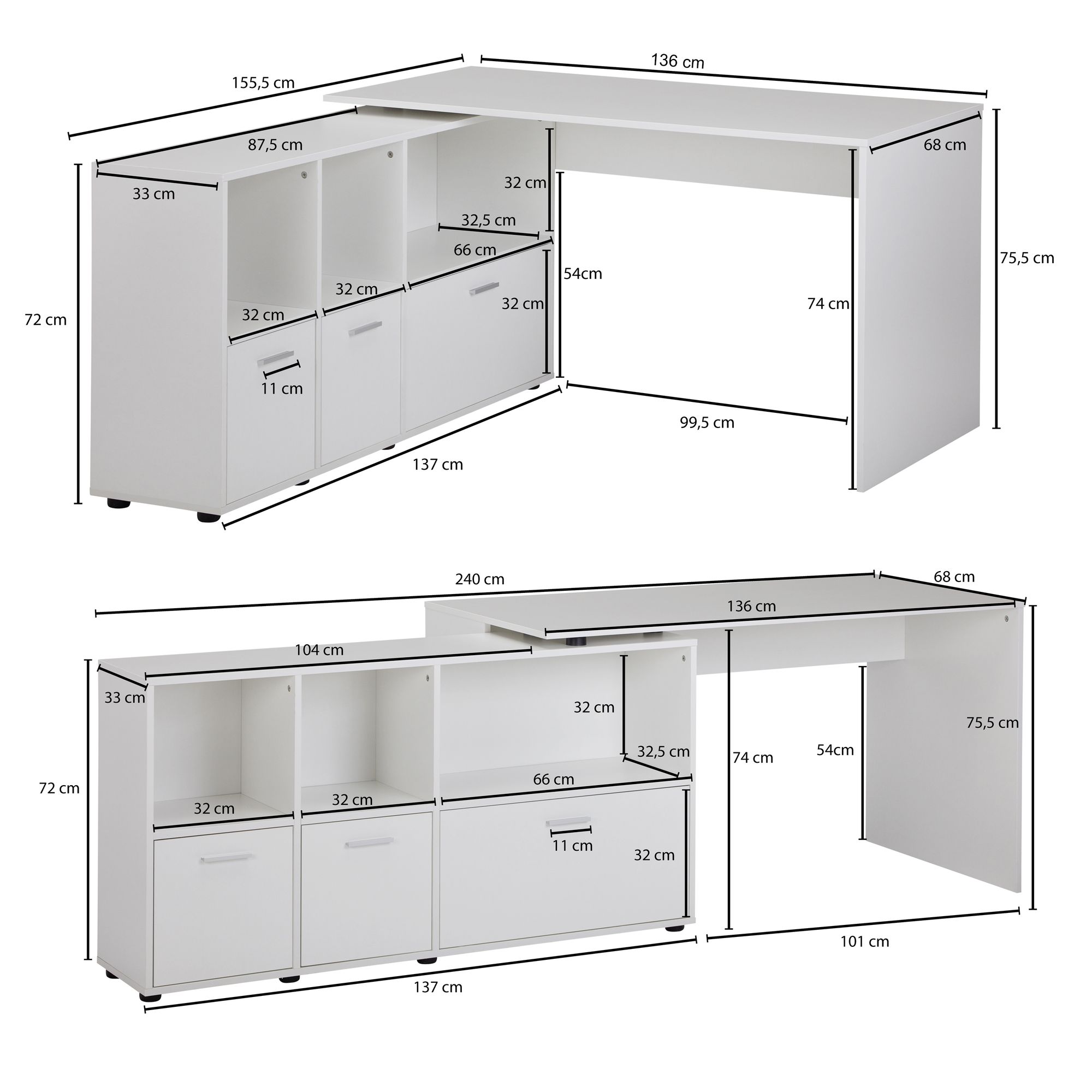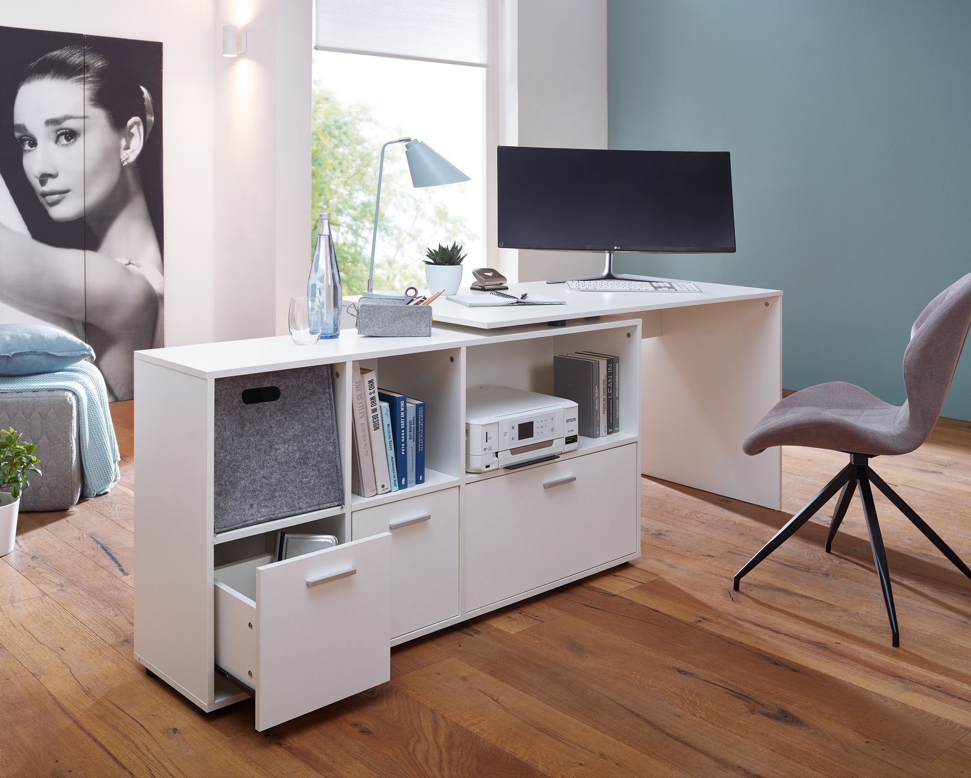 Wohnling Schreibtischkombination WL5.313 136x75,5x155,5cm Weiß Schreibtisch mit Sideboard