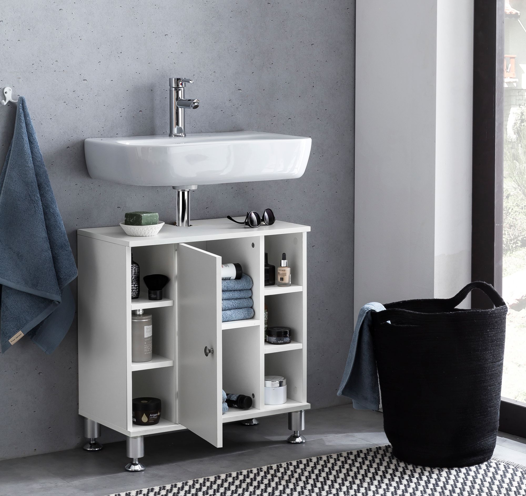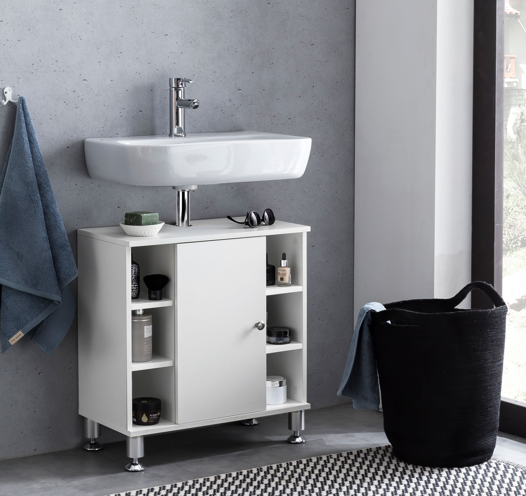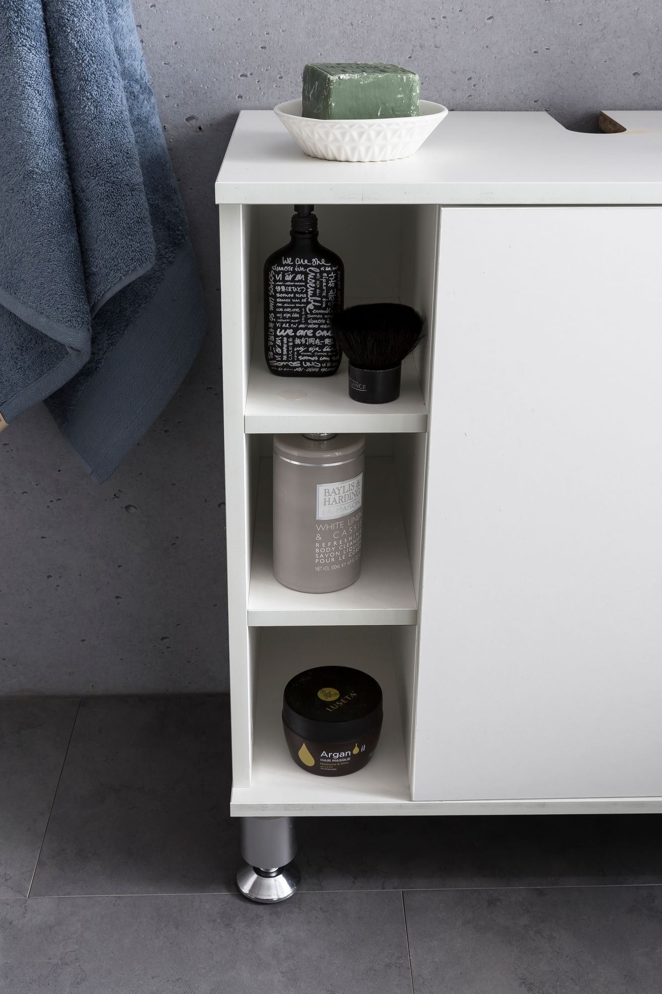 WOHNLING Waschbeckenunterschrank Bubble WL5.752 - 60 x 64 x 32 cm Weiß Badschrank mit Tür | Holz Unterschrank Waschbecken Badezimmer | Waschtischunterschrank mit Fächern | Badezimmerschrank Bad-Möbel mit Ablage