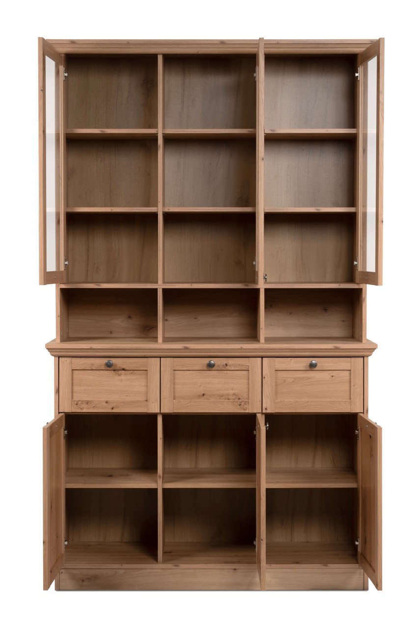 Dieses stilvolle Buffet im Dekor Artisan Oak bietet viel Stauraum und elegantes Design für jedes moderne Wohnzimmer. Es verfügt über 3 Rahmentüren mit Glaseinsatz und je 2 Einlegeböden, 3 offene Fächer, 3 Rahmenschubkästen mit Metallschubführung und 3 Rahmentüren mit je 1 Einlegeboden. Die Metallknöpfe in Antik-Optik und das umlaufende MDF-Kranzprofil verleihen dem Buffet einen klassischen Touch.