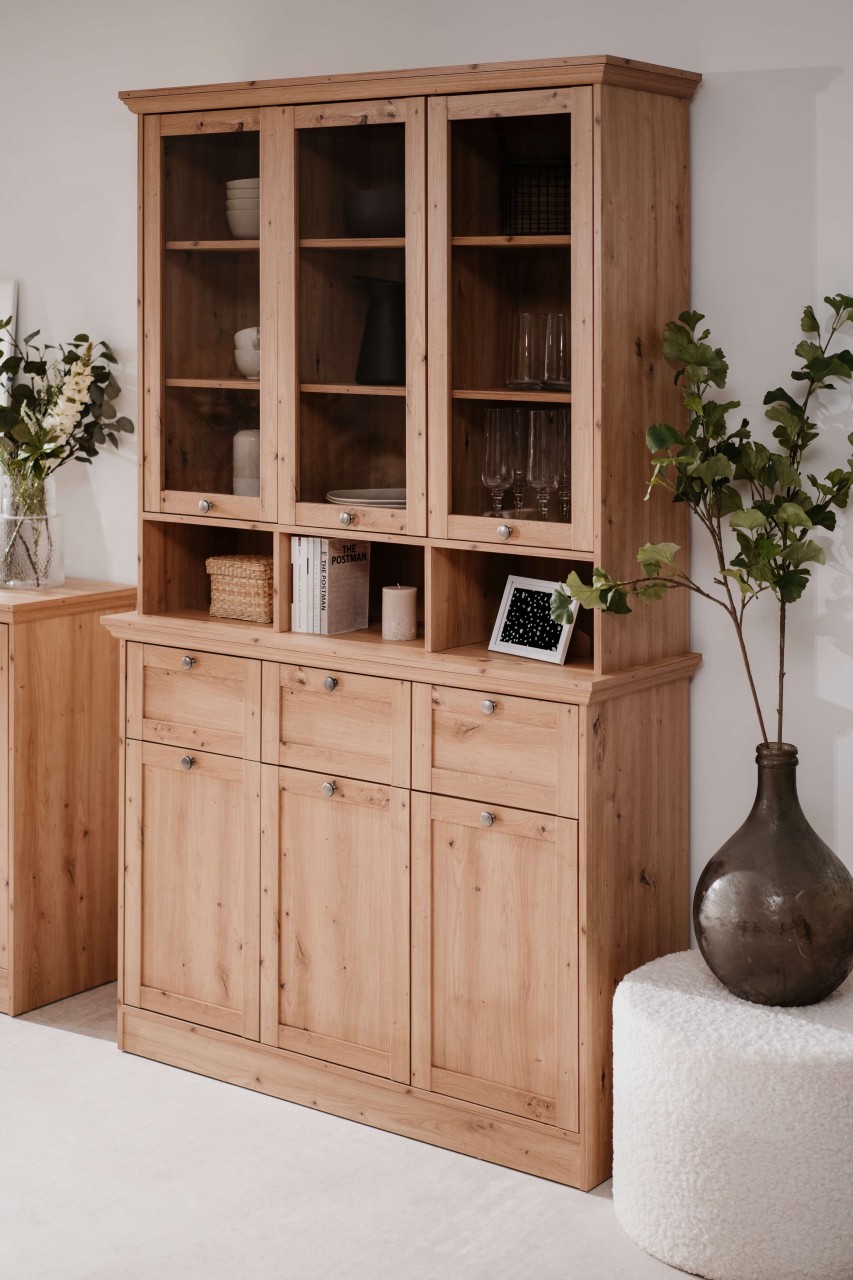 finori Buffet Timber Artisan Oak mit Rahmentüren und Glaseinsatz, offenen Fächern und Schubkästen modern Wohnzimmer