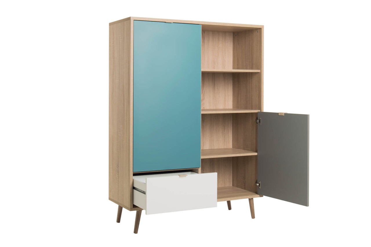 - Highboard mit 2 Türen, 1 Schubkasten und 2 offenen Fächern