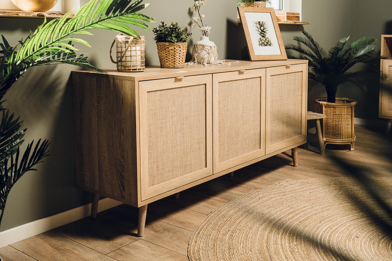Produktinformationen "finori Sideboard Bali 150 cm Dekor Sonoma Eiche & Rafia Geflecht Kommode"