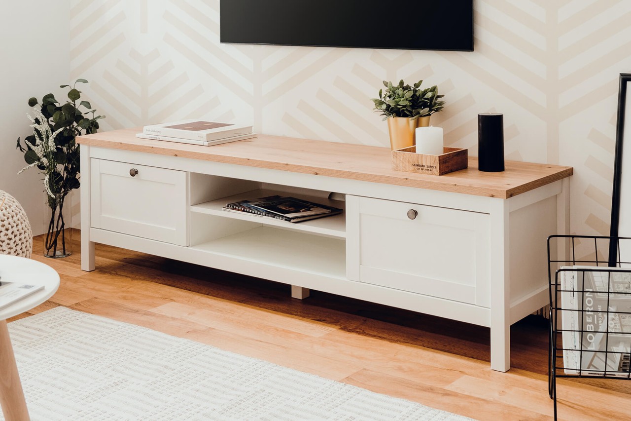 Gerne möchten wir dir das TV-Board Bergen aus dem Hause Finori vorstellen. Dieses schöne Hifi Lowboard im modernen Landhausstil kann deinen Fernseher richtig toll in Szene setzen. Def Fernsehtisch ist besonders strapazierfähig und bietet durch 2 Fächer und große Schubkästen ausreichend Verstaumöglichkeiten. Das moderne Lowboard lässt sich perfekt mit den anderen Produkten der Bergen-Reihe kombinieren. Es handelt sich um pflegeleichtes MDF (foliert), welche mit einem feuchten Tuch einfach zu reinigen ist.