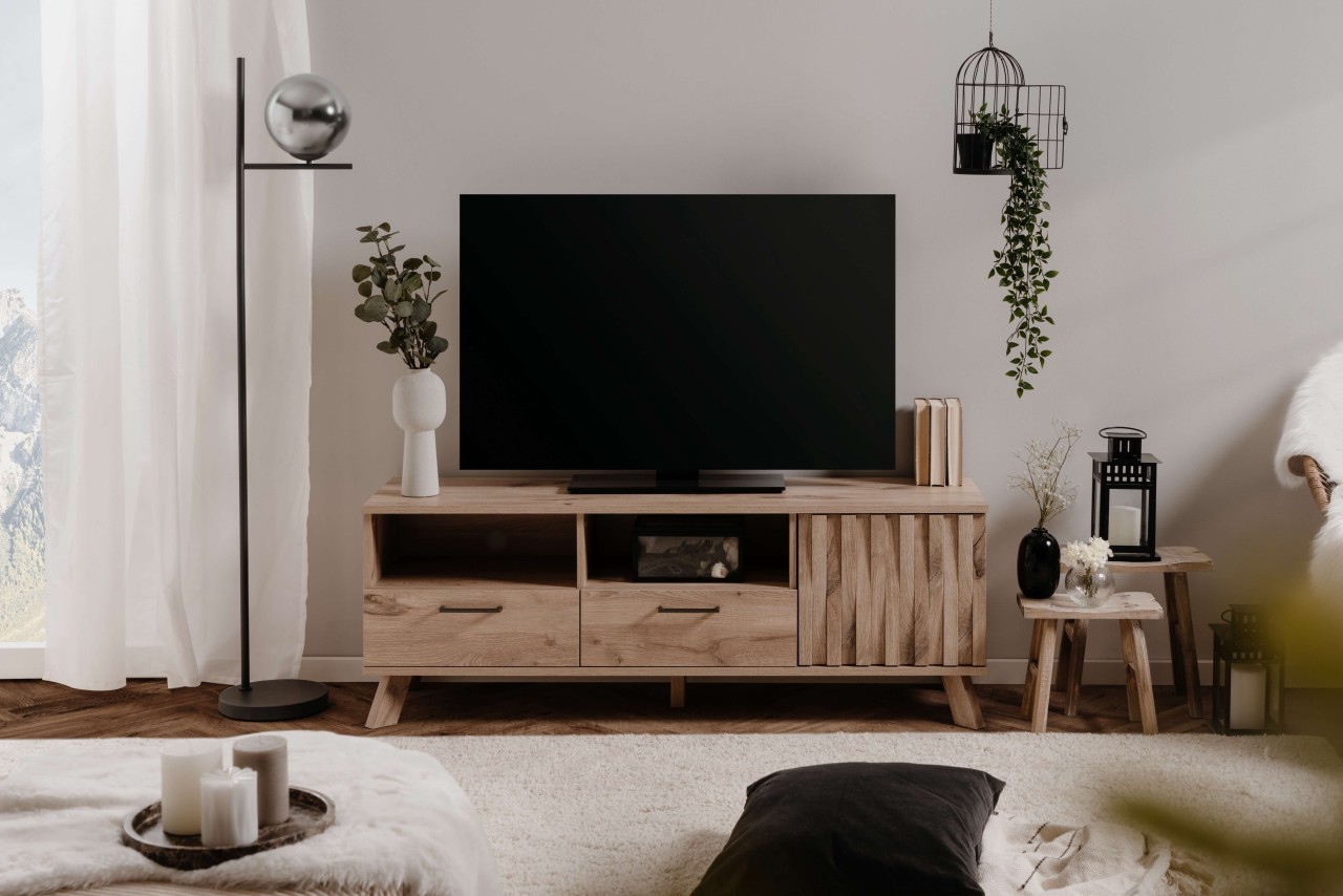 - TV-Board mit 2 offenen Fächern, 1 Tür und 2 Schubkästen