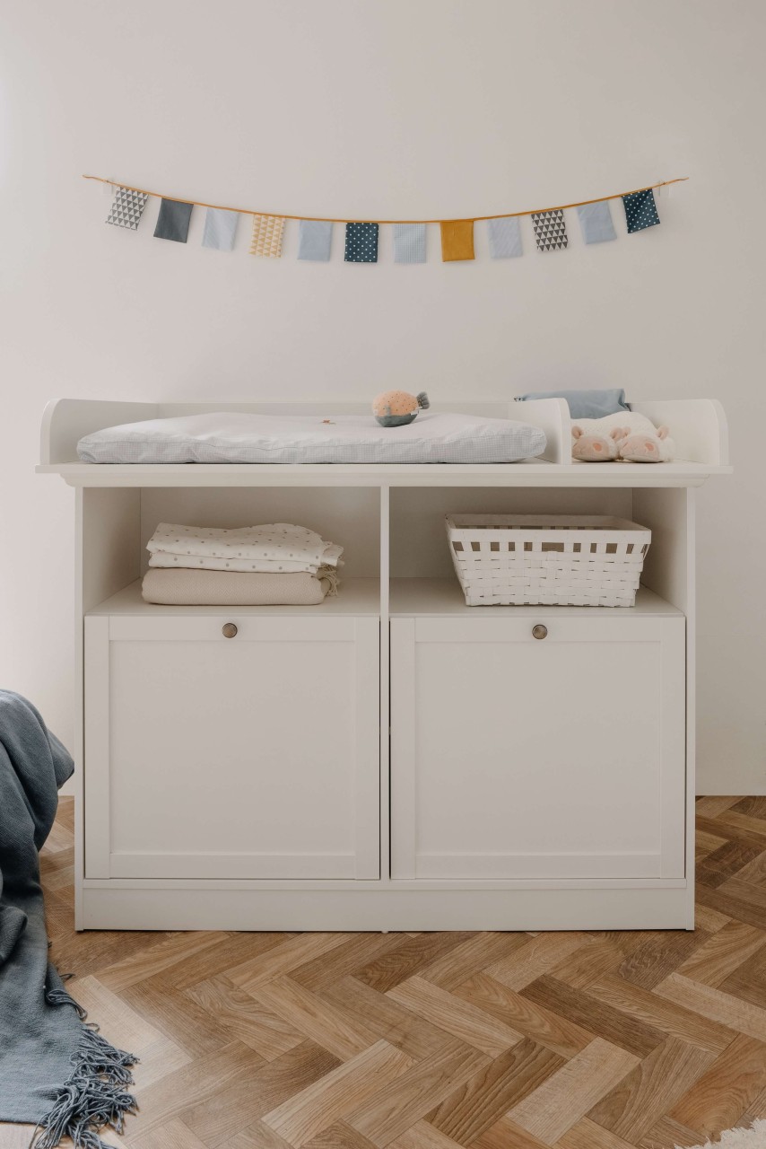 Die Wickelkommode Landwood bietet eine praktische und elegante Lösung für Ihr Kinderzimmer. Mit 2 offenen Fächern, 2 Türen und 2 Einlegeböden bietet sie viel Stauraum. Der abnehmbare Wickeltisch ermöglicht eine flexible Nutzung – auch ohne Wickeltisch als Kommode. Hergestellt in Europa, überzeugt die Wickelkommode durch hohe Materialqualität und Verarbeitung.