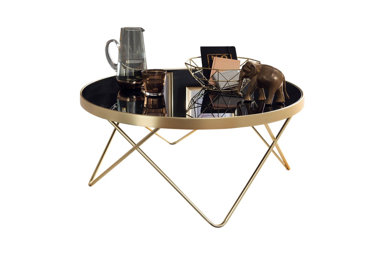 Wunderschöner Glastisch mit Goldgestell aus Metall runder Sofatisch schwarz von tinkaro