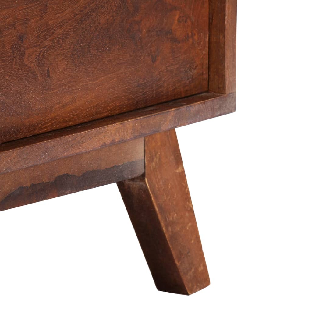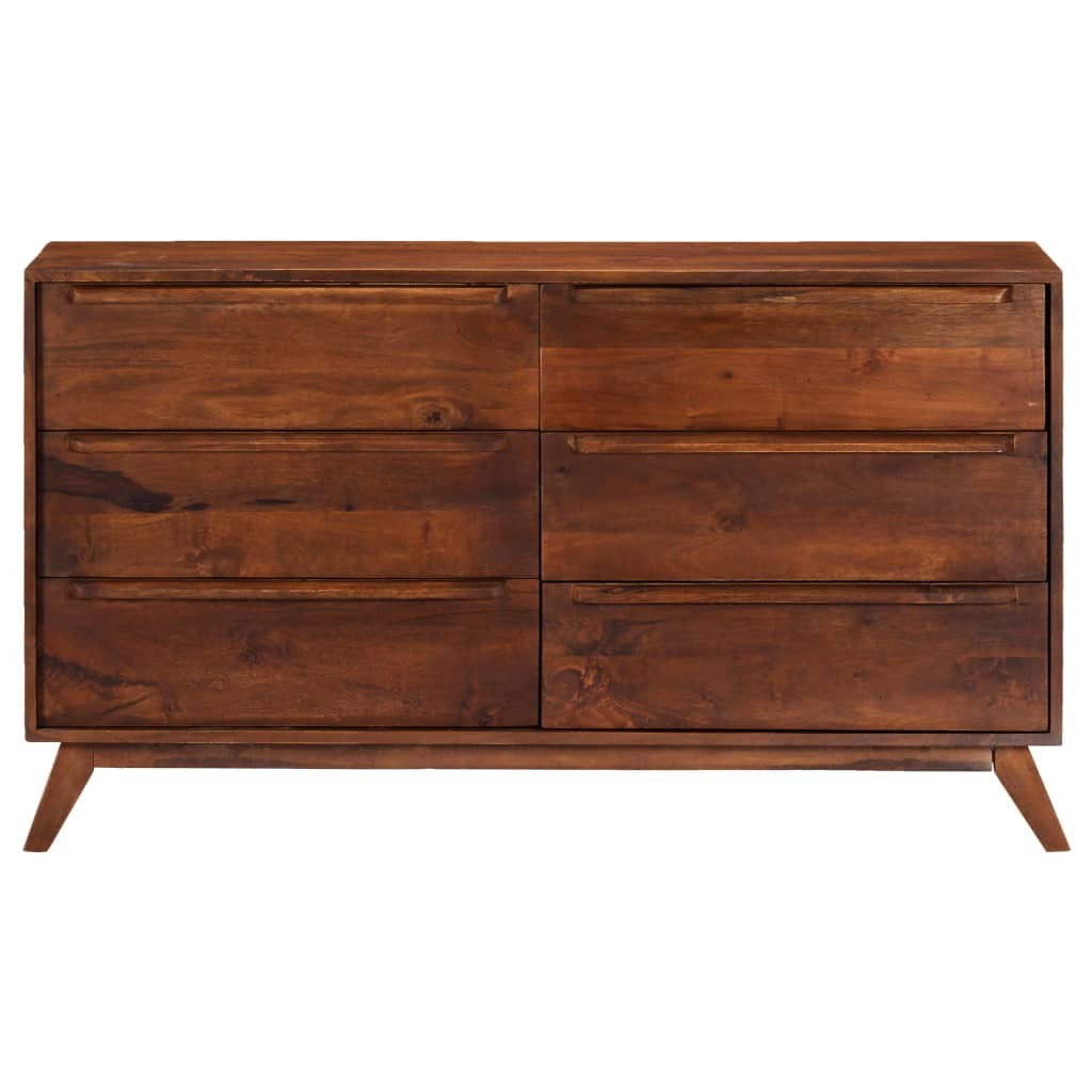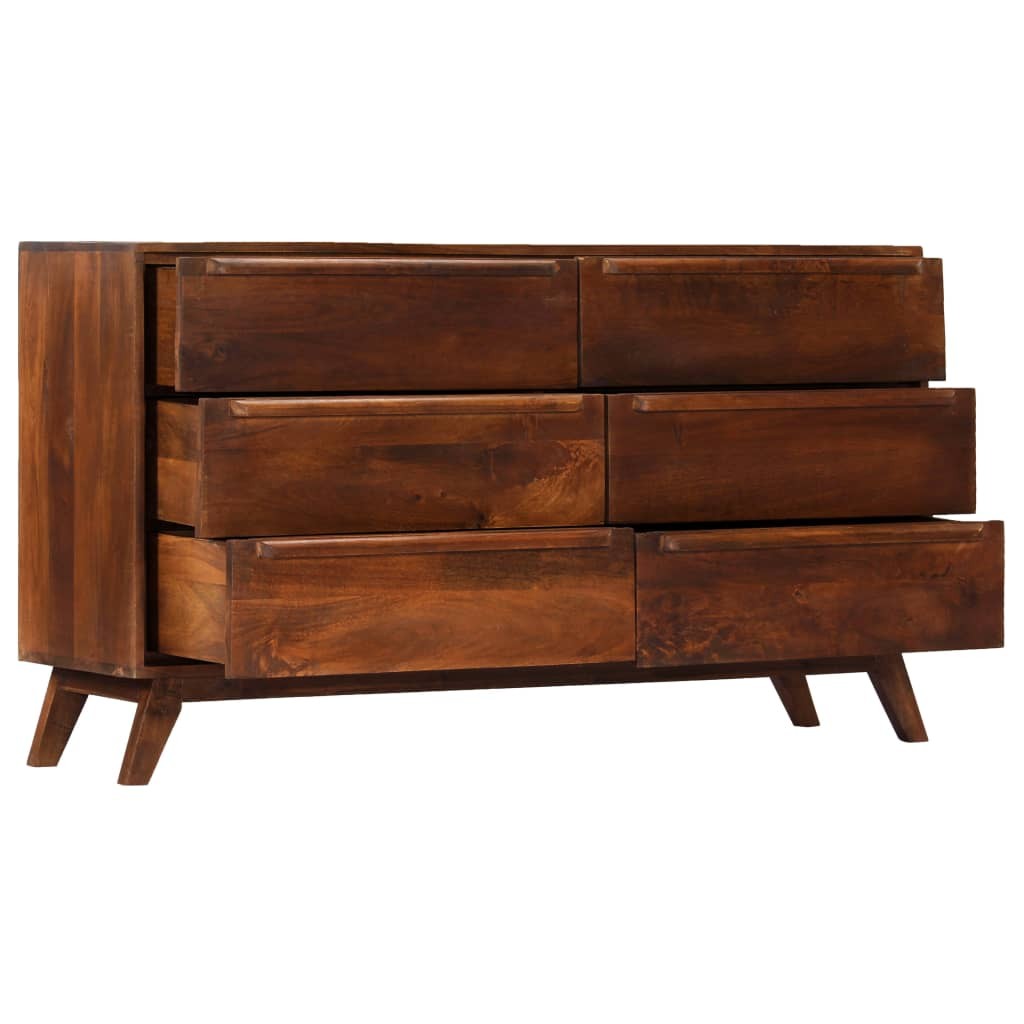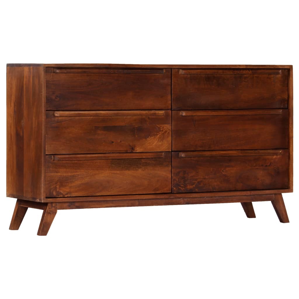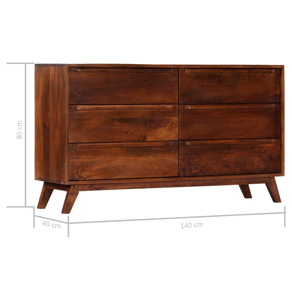bringen Sie den Luxus des Designs der Mitte des Jahrhunderts in Ihre Inneneinrichtung! Dieses Sideboard aus massivem Mangoholz ist eine praktische und zugleich sehr dekorative Ergänzung zu Ihrem Schlafzimmer, Wohnzimmer oder Flur. Raues Mangoholz hat nicht nur die Stärke, das Gewicht zu tragen, sondern hält auch dem Verschleiß der Zeit stand. Sei es Polieren oder Beschichten, jeder Schritt des Fertigungsprozesses wird mit größter Sorgfalt durchgeführt. Darüber hinaus bietet dieses Sideboard im Vintage-Stil viel Stauraum mit seinen 6 Schubladen. Wichtiger Hinweis: Farben und Holzmaserung variieren von Stück zu Stück, was jedes unserer Regale einzigartig macht.