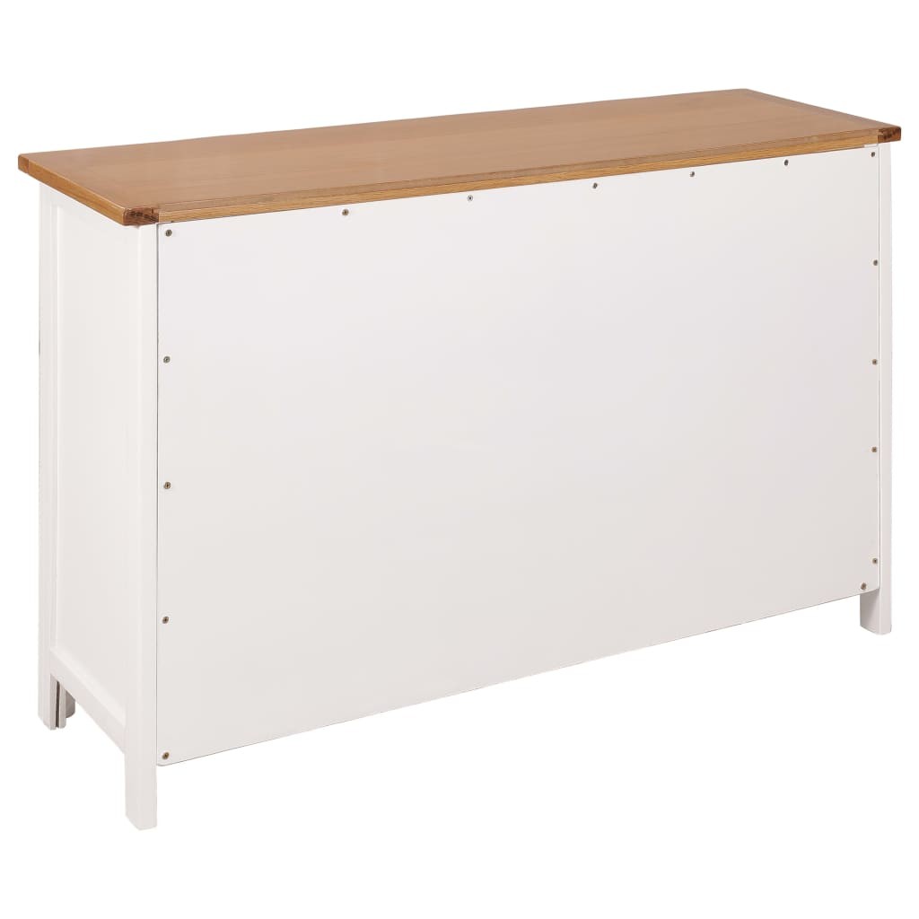 Dieses Sideboard wurde fachmännisch aus langlebigem, massiven Eichen- und Akazienholz gefertigt. Die klare Linienführung und die polierten Metallknäufe verleihen dem Möbelstück im Landhaus-Stil eine moderne Note.