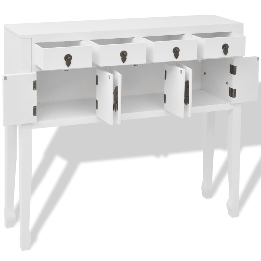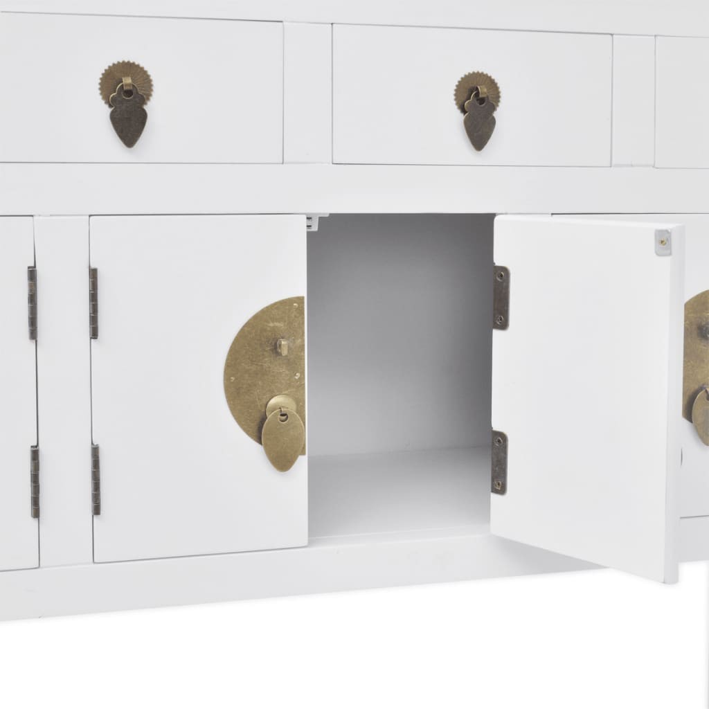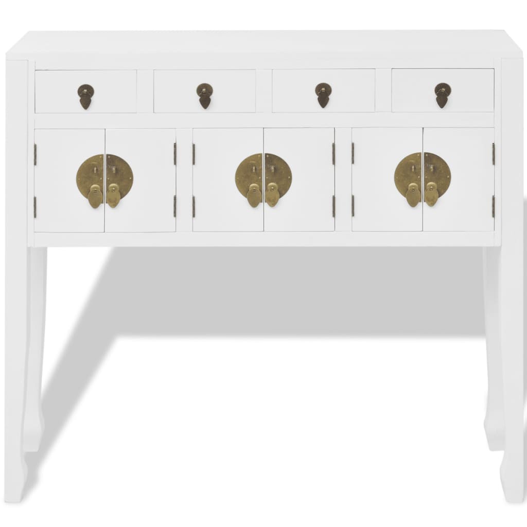 Es kann auch als TV-Schrank, Highboard, Konsolentisch, Konsolenschrank, Seitenschrank, Anrichte in chinesischem Stil verwendet werden. Es verfügt über 4 Schubladen und 3 Minischränke, die viel Platz zur Aufbewahrung verschiedener Sachen und von Schmuck bieten. Gefertigt aus qualitativ hochwertigem Massivholz mit weißer Lackierung, ist dieses Sideboard sehr robust und langlebig.