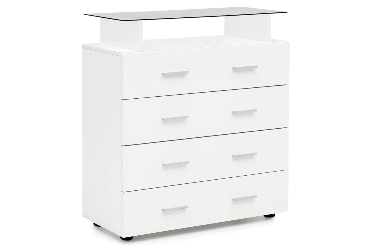 - Kommode mit vier Schubladen und einer Glasplatte