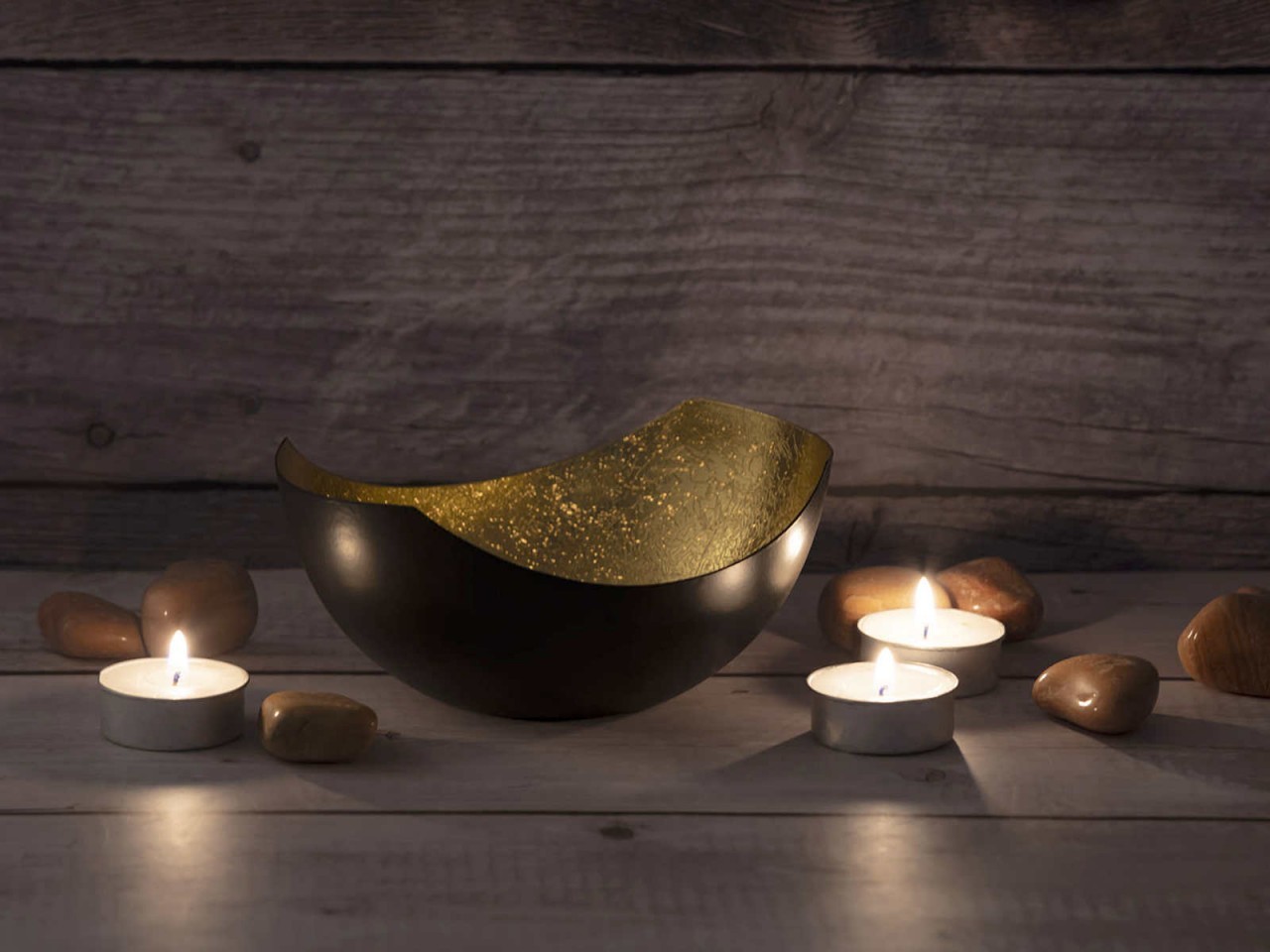 - Filigranes Metallblech in Schwarz matt, innen mit Gold-Metallfolie veredelt