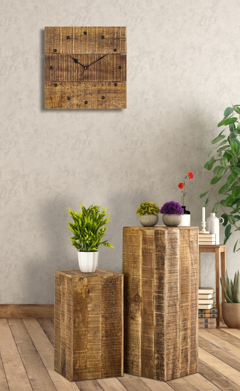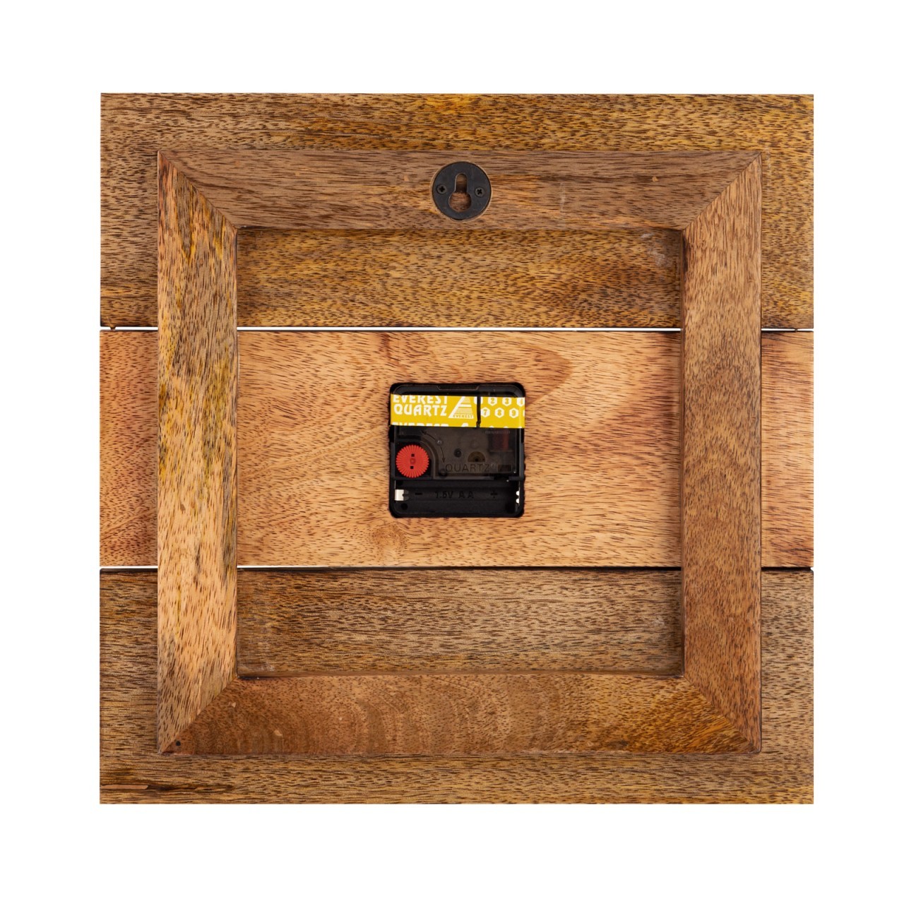 - quadratische Holzuhr mit rustikaler Säge-rauer Struktur